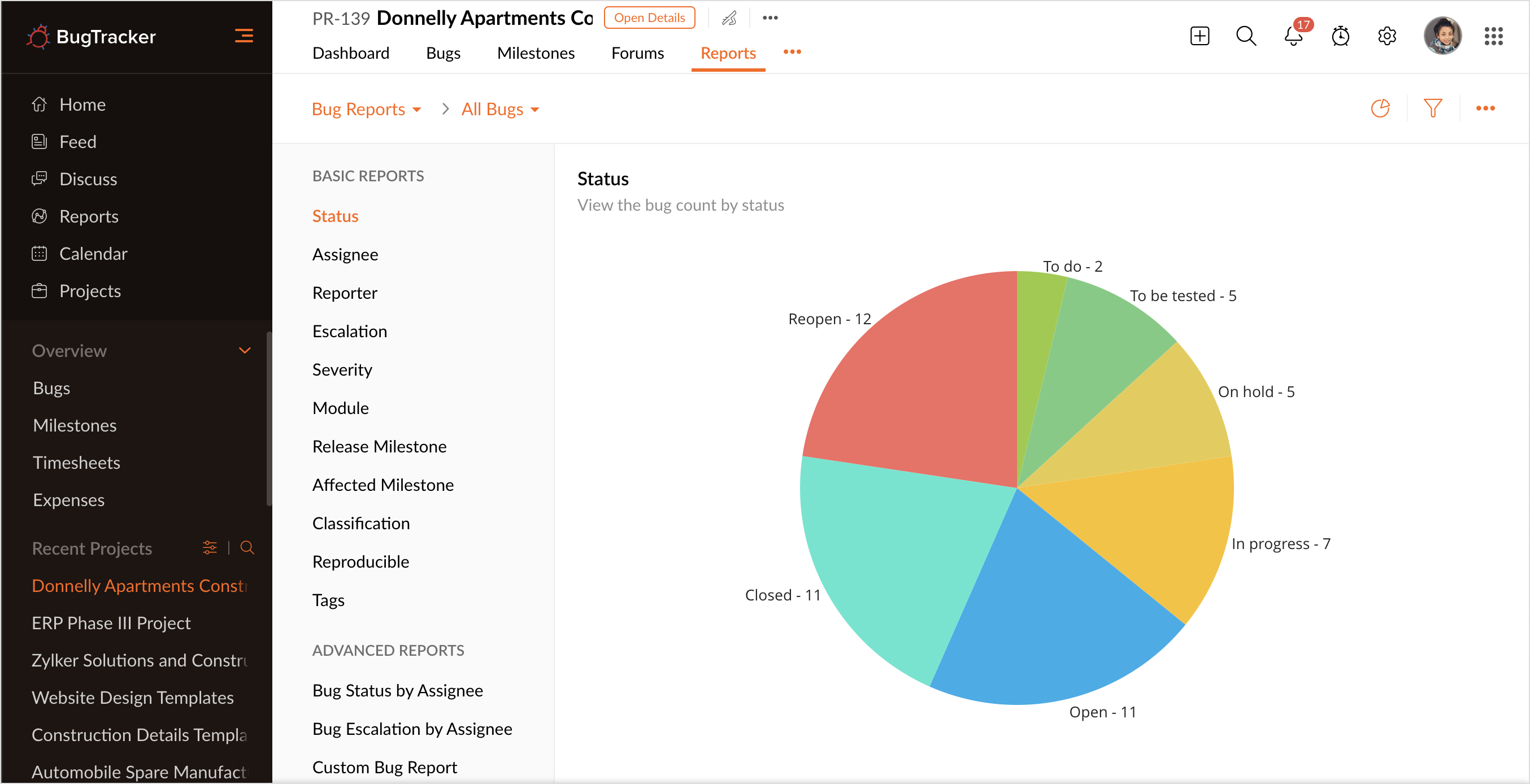 Basic reports show the status of bugs using the most common parameters. Scroll down to see the report in a tabular form. Click on a bar to show bugs for the given status.