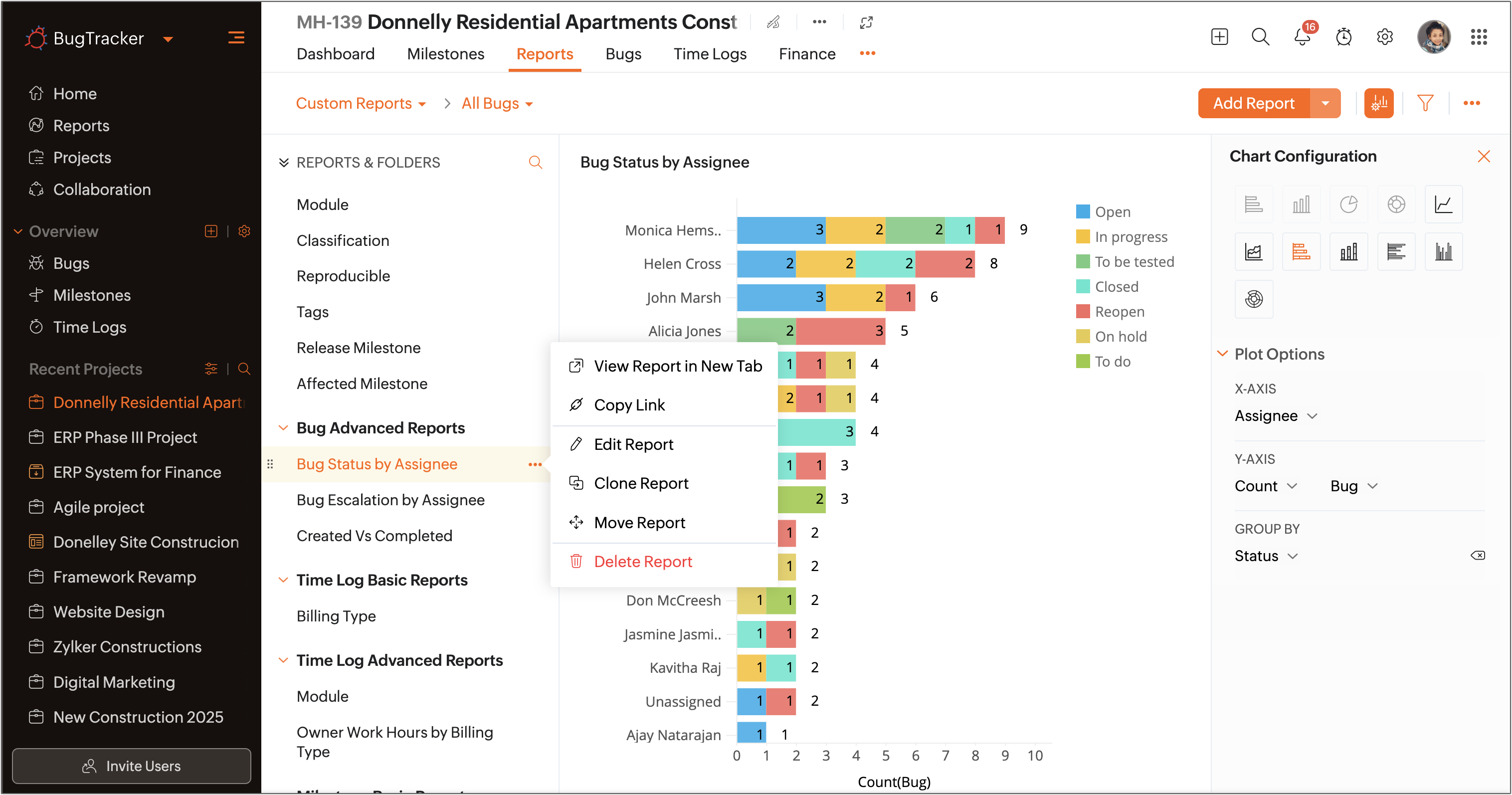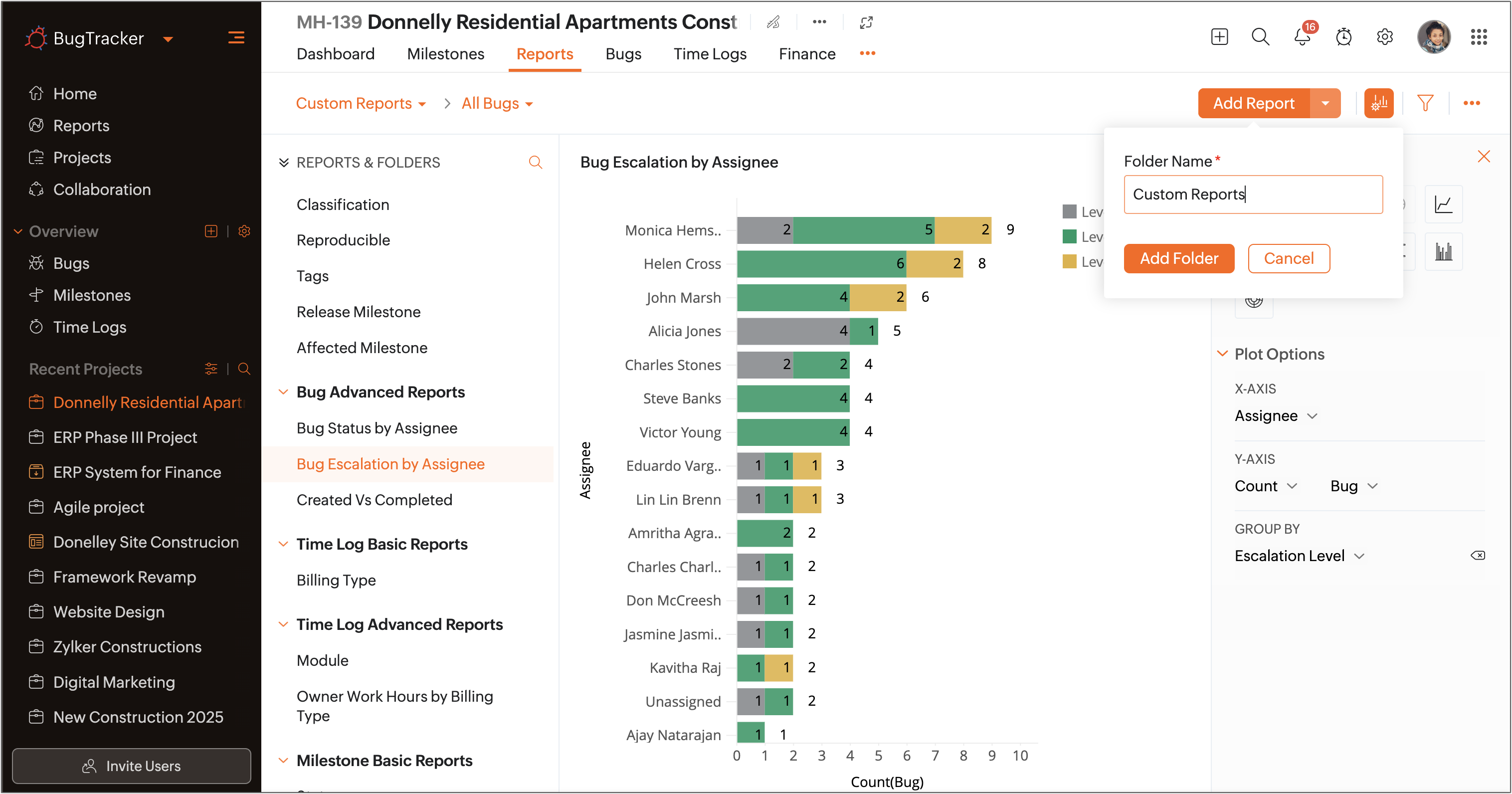 Custom Reports allow you to create tailored visualizations of your project data. Define your own criteria and generate advanced module-level reports using multiple data points. Build customizable reports for Bugs, Time Logs and Phases by plotting the independent and dependent variables. Save and organize these reports under folders for efficient tracking and analysis.