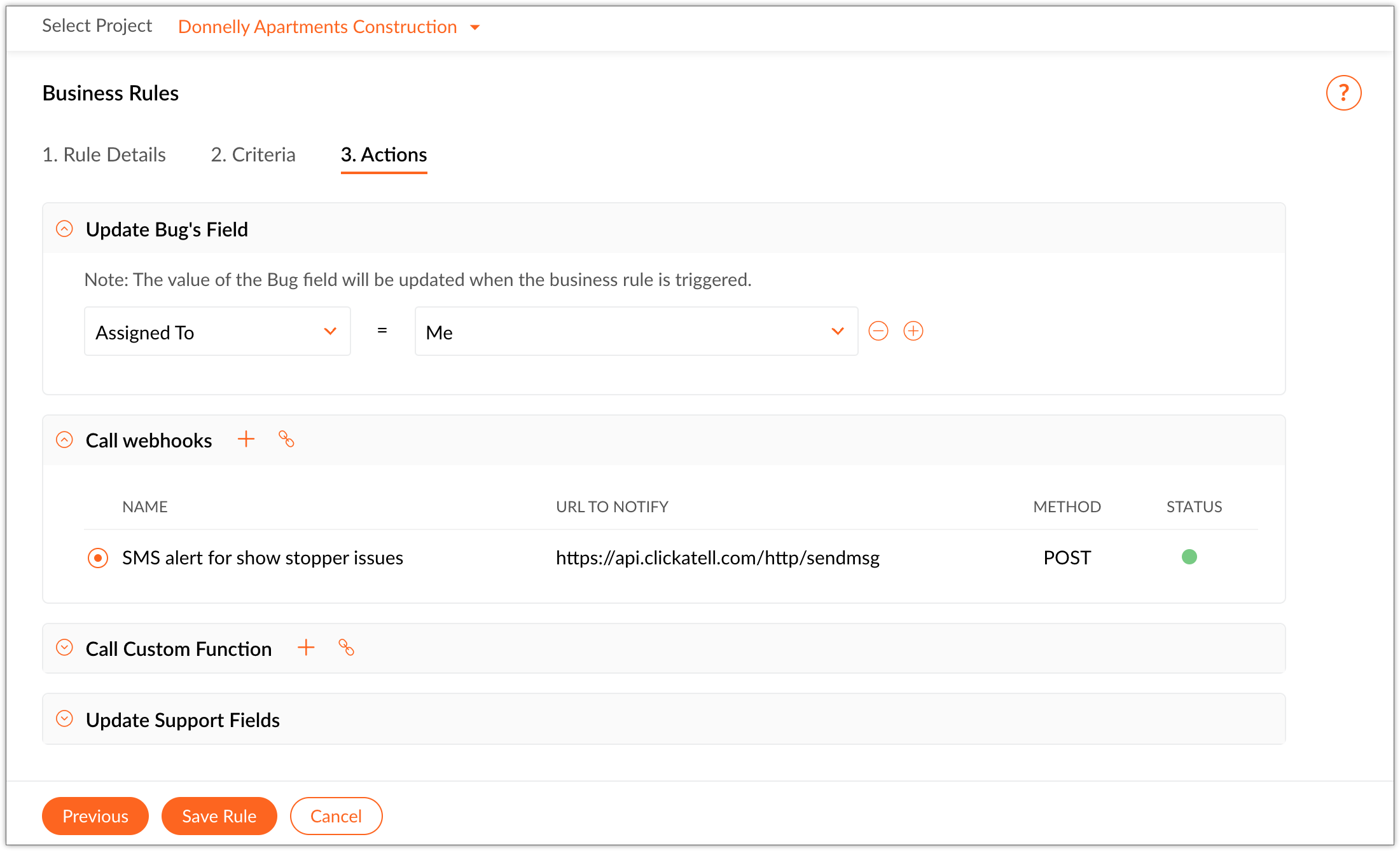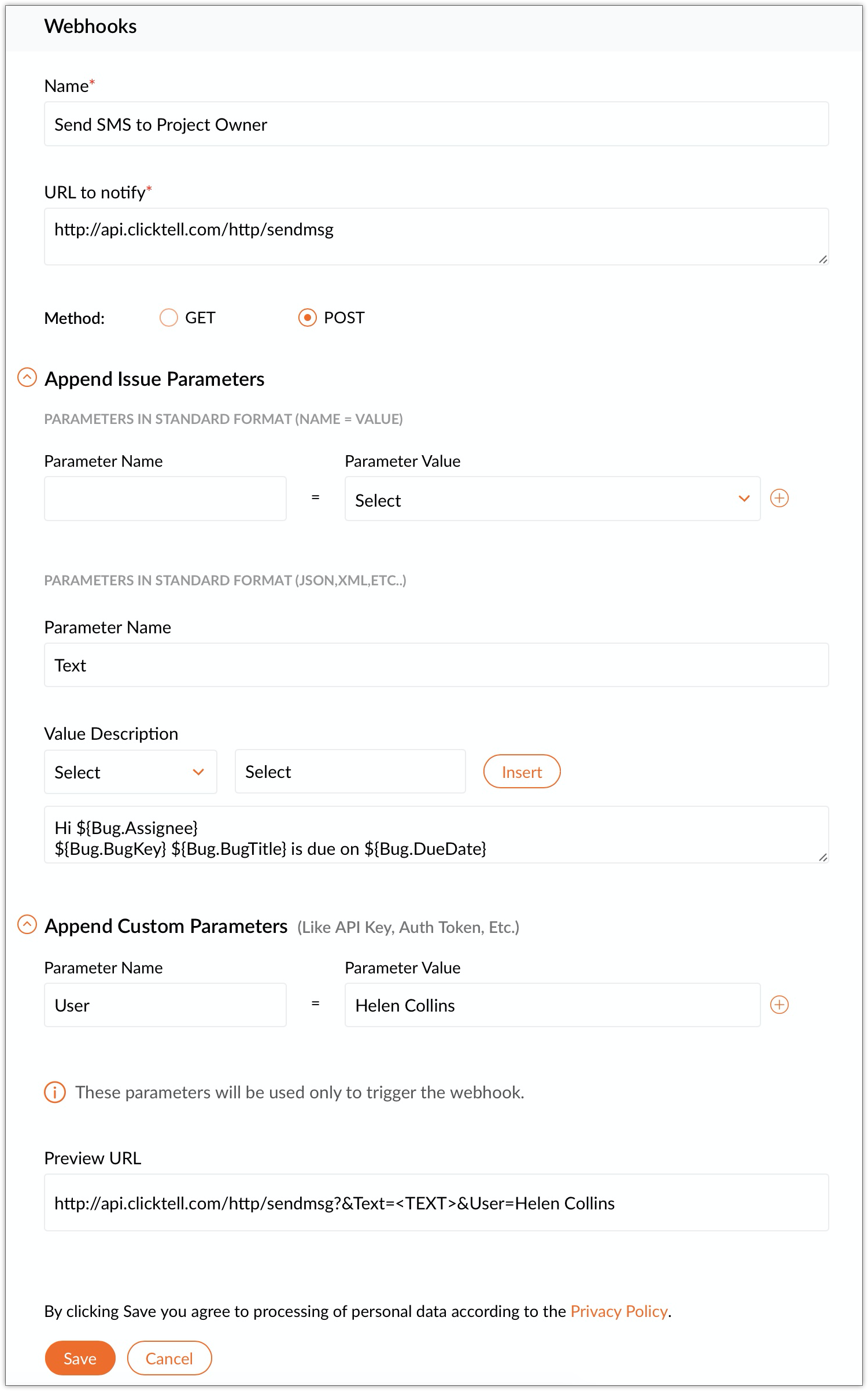 Webhooks facilitate automated HTTP notifications to third party applications from Zoho BugTracker. Using Webhooks, you can configure your own HTTP URLs and associate them to specific business rules in order to automate the entire notification process related to bugs. To know more about Webhooks, please refer to WebHooks.org.