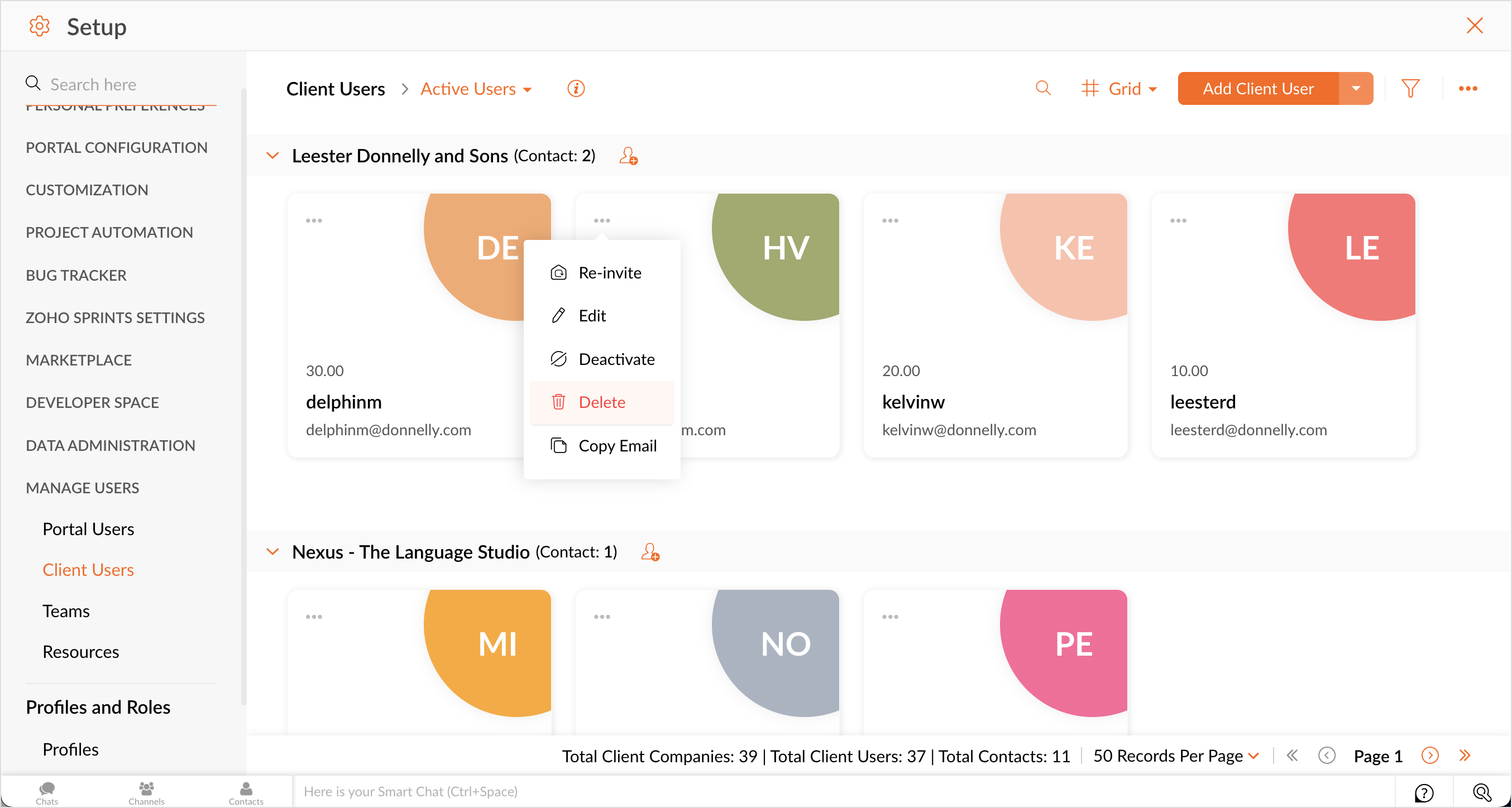 An email invite is sent to the client user's along with a link to access the portal. You can re-invite client users by hovering over the profile card, clicking on > Re-invite, after 24 hours if they have not accessed the link in the invitation email. Alternatively, right click on the user profile and click Re-invite.