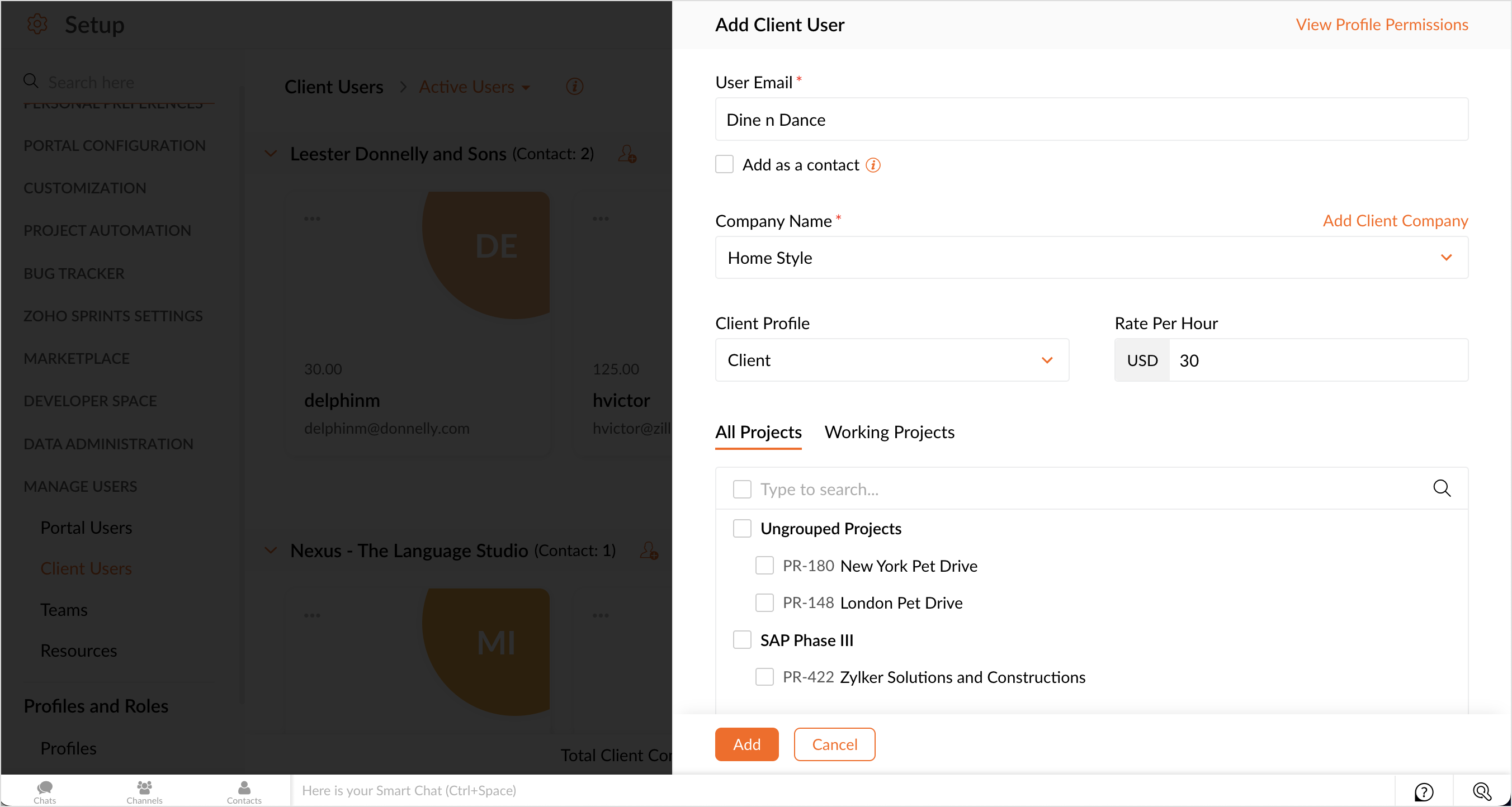 Enter an Email address and a Rate Per Hour for the user (you'll only see the Rate Per Hour field if your portal is integrated with Zoho Invoice)