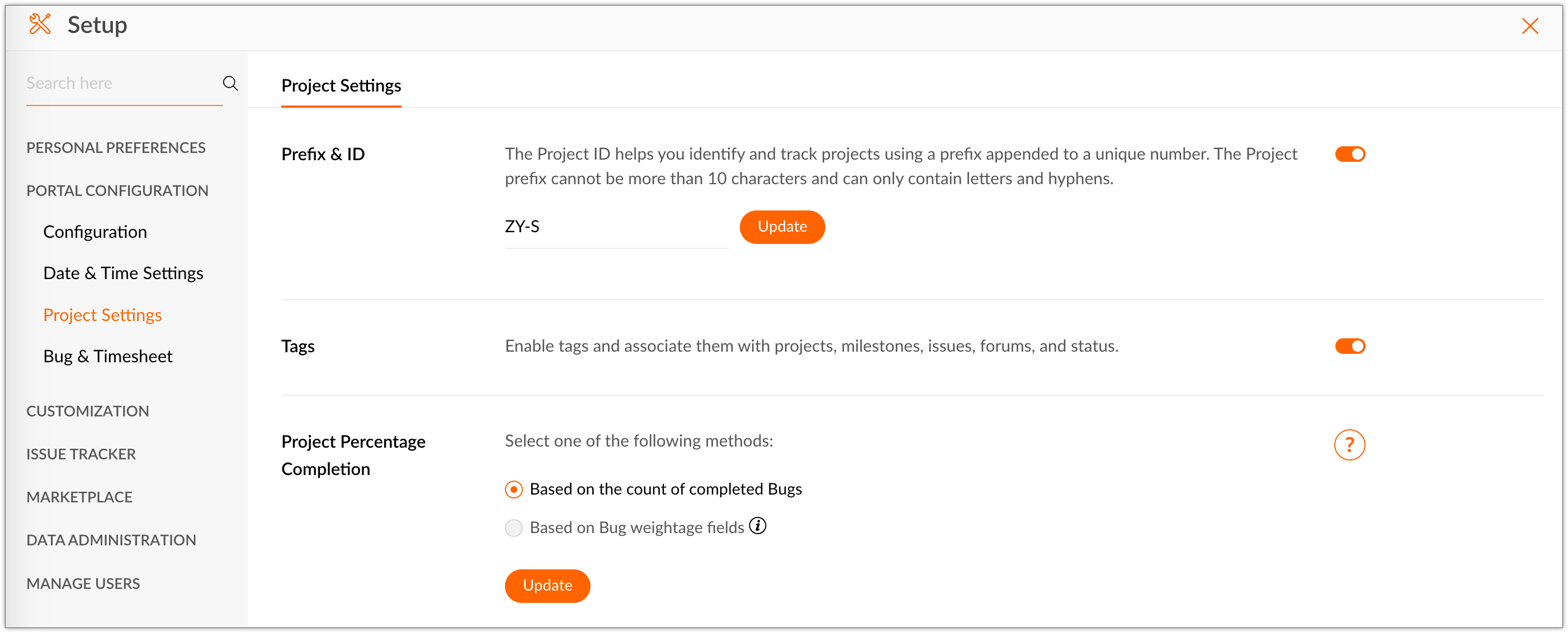 We shall learn how to edit project prefix, enable tags, and modify project completion calculation. Project Prefix Click in the top navigation panel. Navigate to Portal Configuration > Project Settings > Project Settings tab. In the Prefix & ID ...