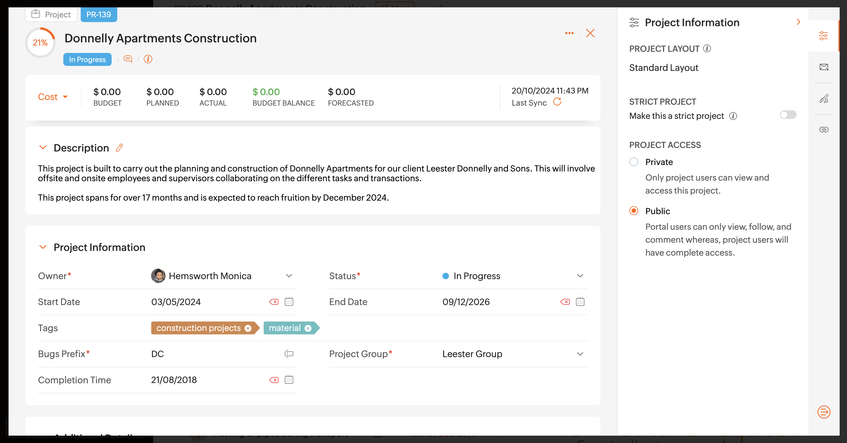 Manage Project settings such as project ID, tags, and project percentage completion.