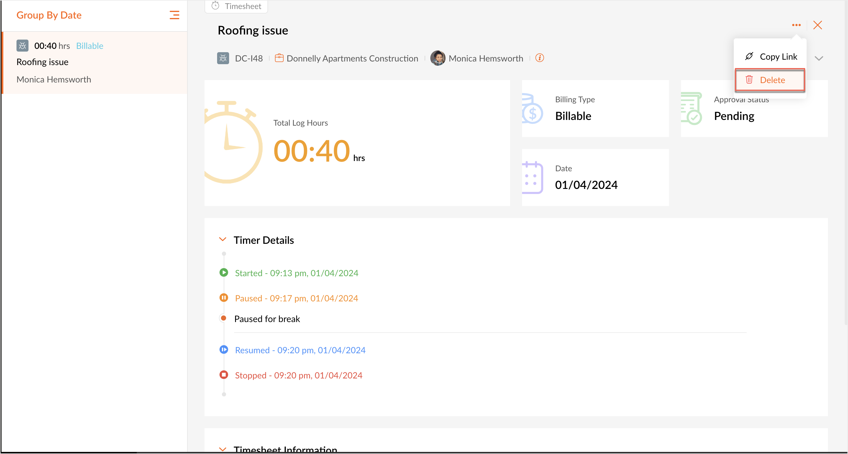 In the Timesheet Details page, view the time log information of the bugs. Users can also modify the timesheet or move the timesheet from one bug to another. Benefits View the summary of the Time Log information. Navigate to the associated bug ...