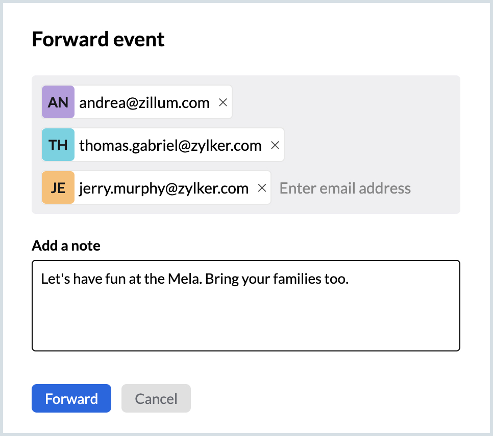 When you create an event in Zoho Calendar, you can send invitations to attendees through email, calendar invite, or both. If you want to allow the attendees to forward the invite to people apart from the attendees added by you, select the Allow forward check-box when you create an event.