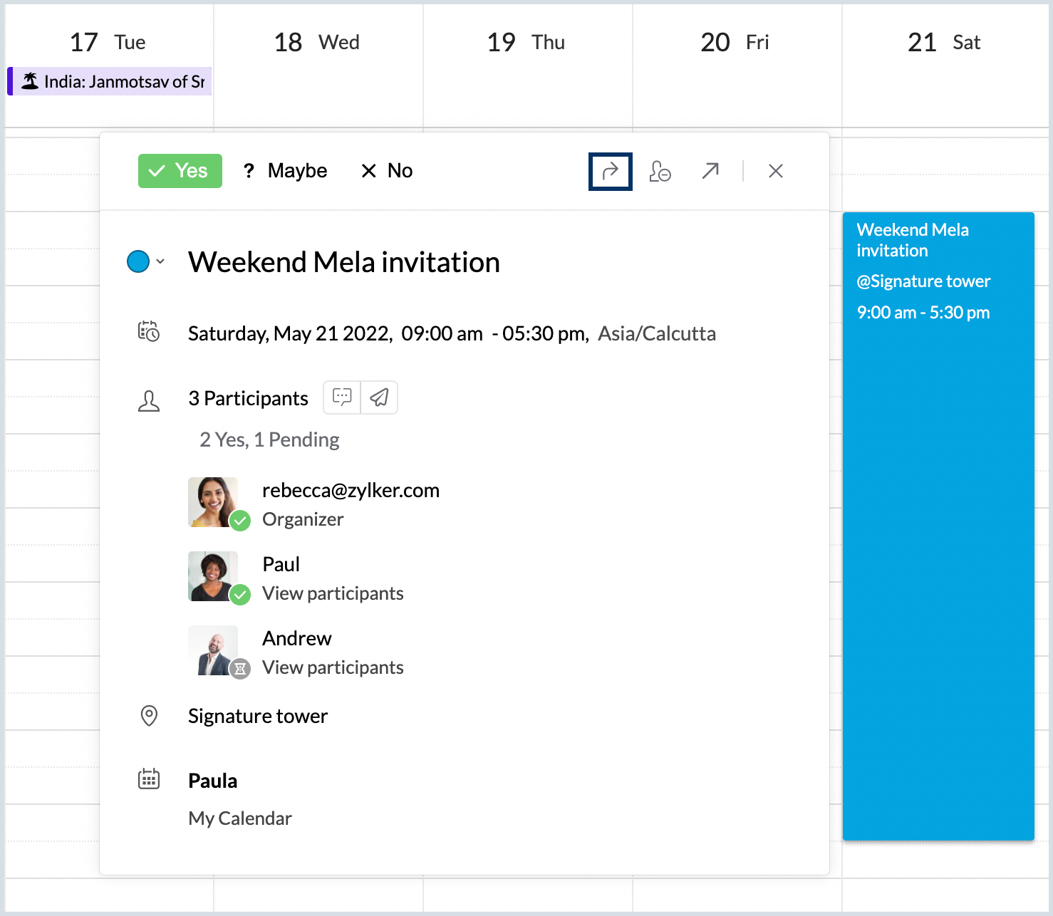An email will be sent to the recipients with the event invitation. The recipients can RSVP to the event invite by choosing Yes/ No/ Maybe from the event invitation card.