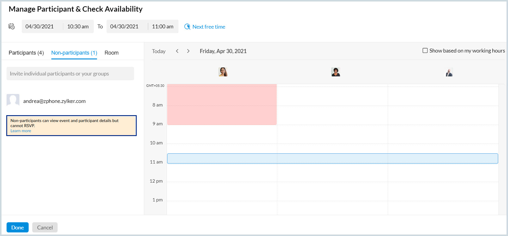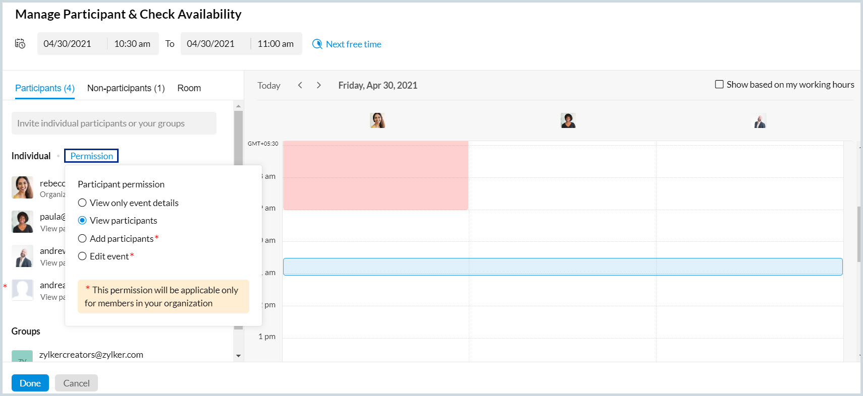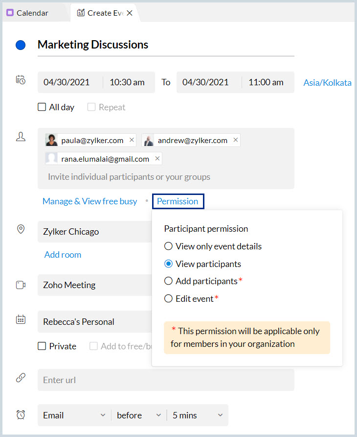 In Zoho Calendar, the participant permissions can be chosen by the organizer of the event. The participant permissions can be set at event level and can be managed for individual participants.