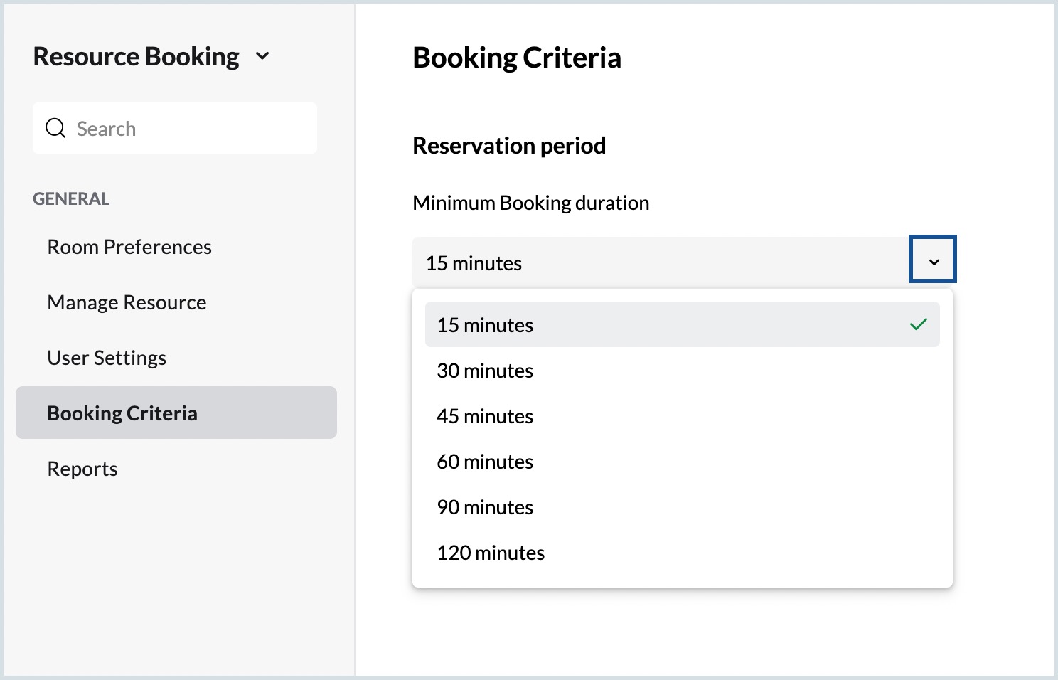 The admin can specify a minimum duration to book a resource. The users will not be able to book the resource for a duration lesser than the duration set by the admin. For example, if the Minimum Booking Duration set by the admin is 30 minutes, then, the user will not be able to book a resource for 15 minutes.