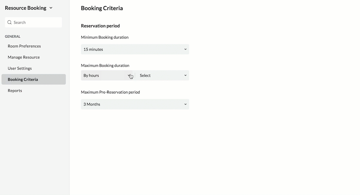 In Zoho Calendar, the resource booking settings provides various options for admins to efficiently manage their resources. The admins can specify a minimum and maximum booking duration for any resource and also provide a reservation period to pre-book the resources. The admin can access these options from the booking criteria section of Resource booking settings.