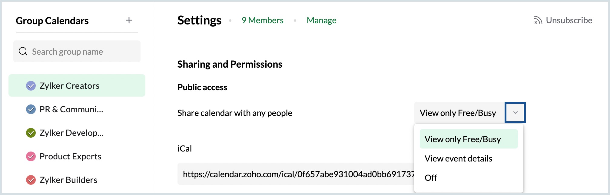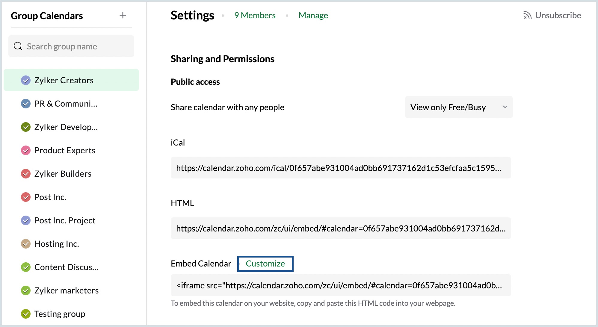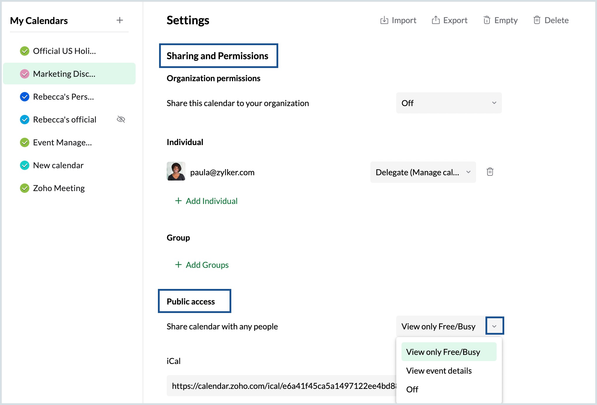 Calendars in Zoho Calendar can be shared with individuals and groups. After creating a calendar and adding events to it, you can make the calendar public and include various access permissions to the calendar, after which one can simply view the ...