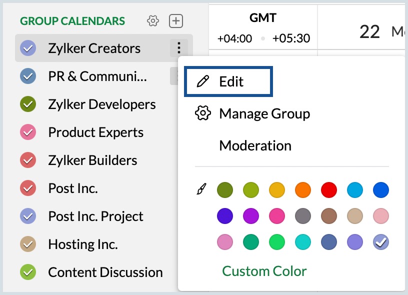 2. Right click the calendar under Group Calendars from the left pane of the calendar window and click Edit (or) Go to Settings  > Calendar > Group Calendars and click on the calendar.