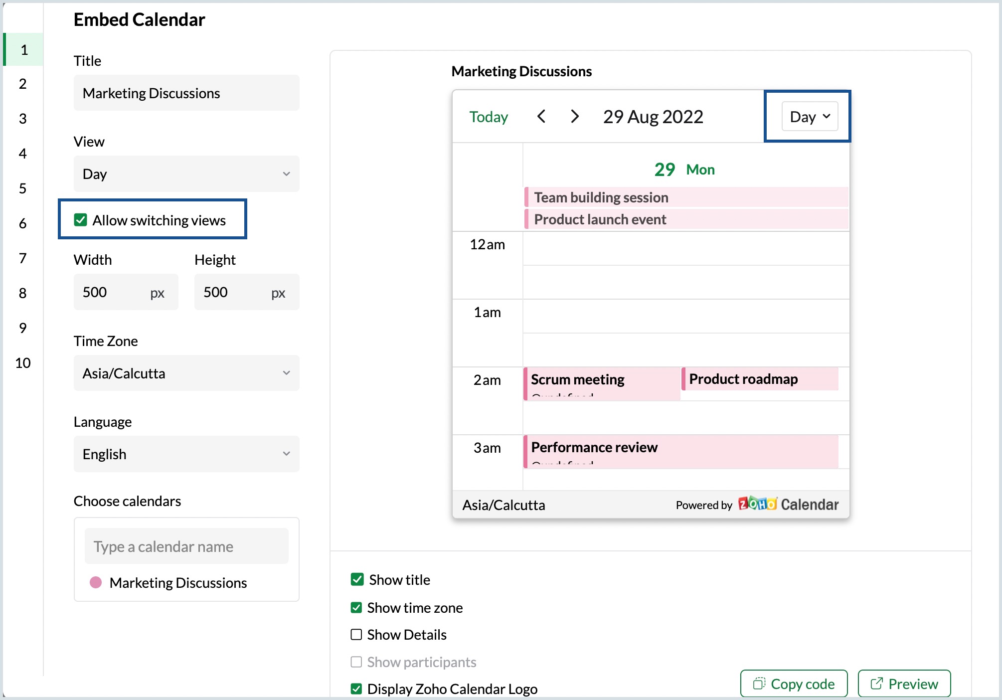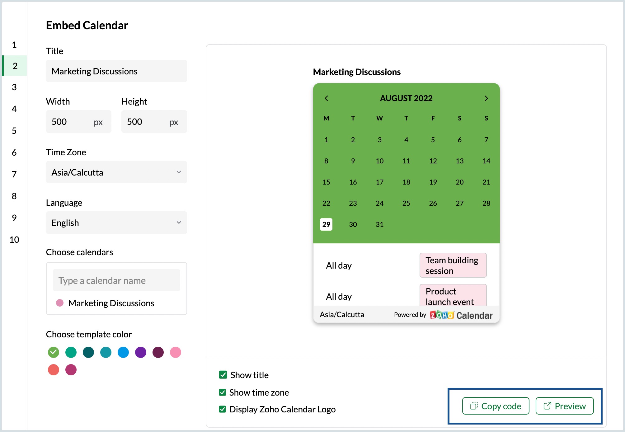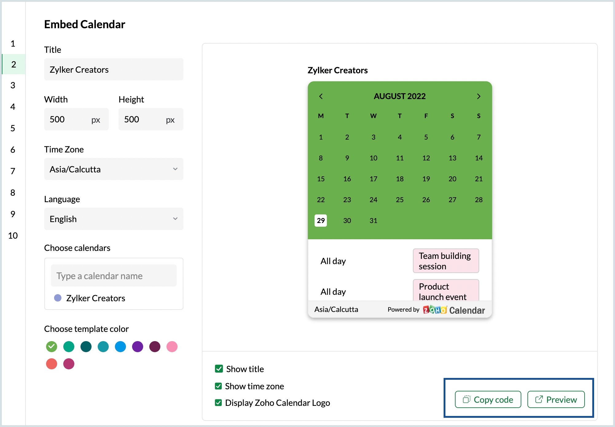 6. Select if you want to display the calendar title, time zone and the Zoho Calendar logo.
