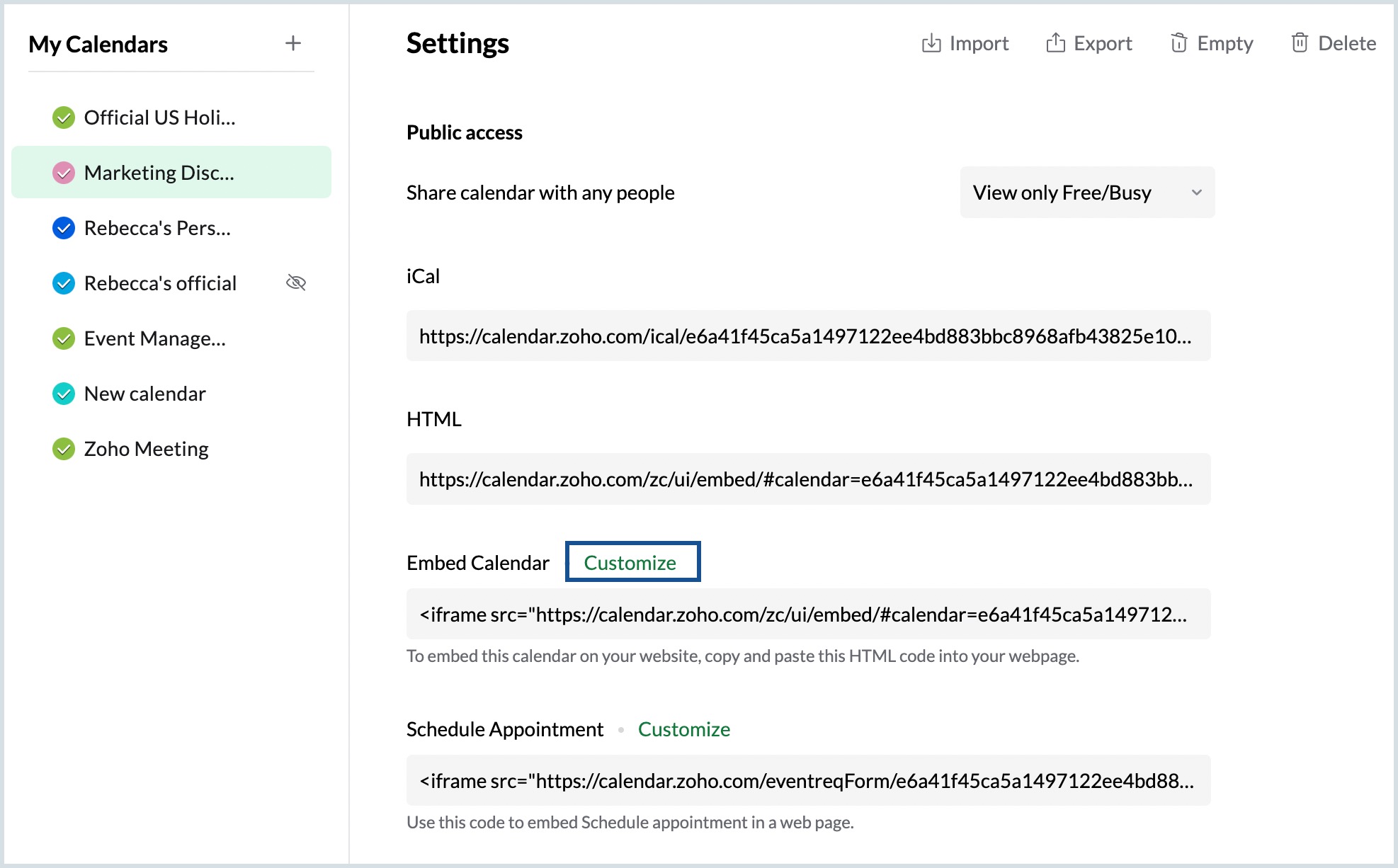 With Zoho Calendar, you can export your calendar events as URLs of two kinds: Private and Public. These URLs can be used by others to either import the events to their calendars or to subscribe and get updates about your schedule.  Public/Embed URL: ...