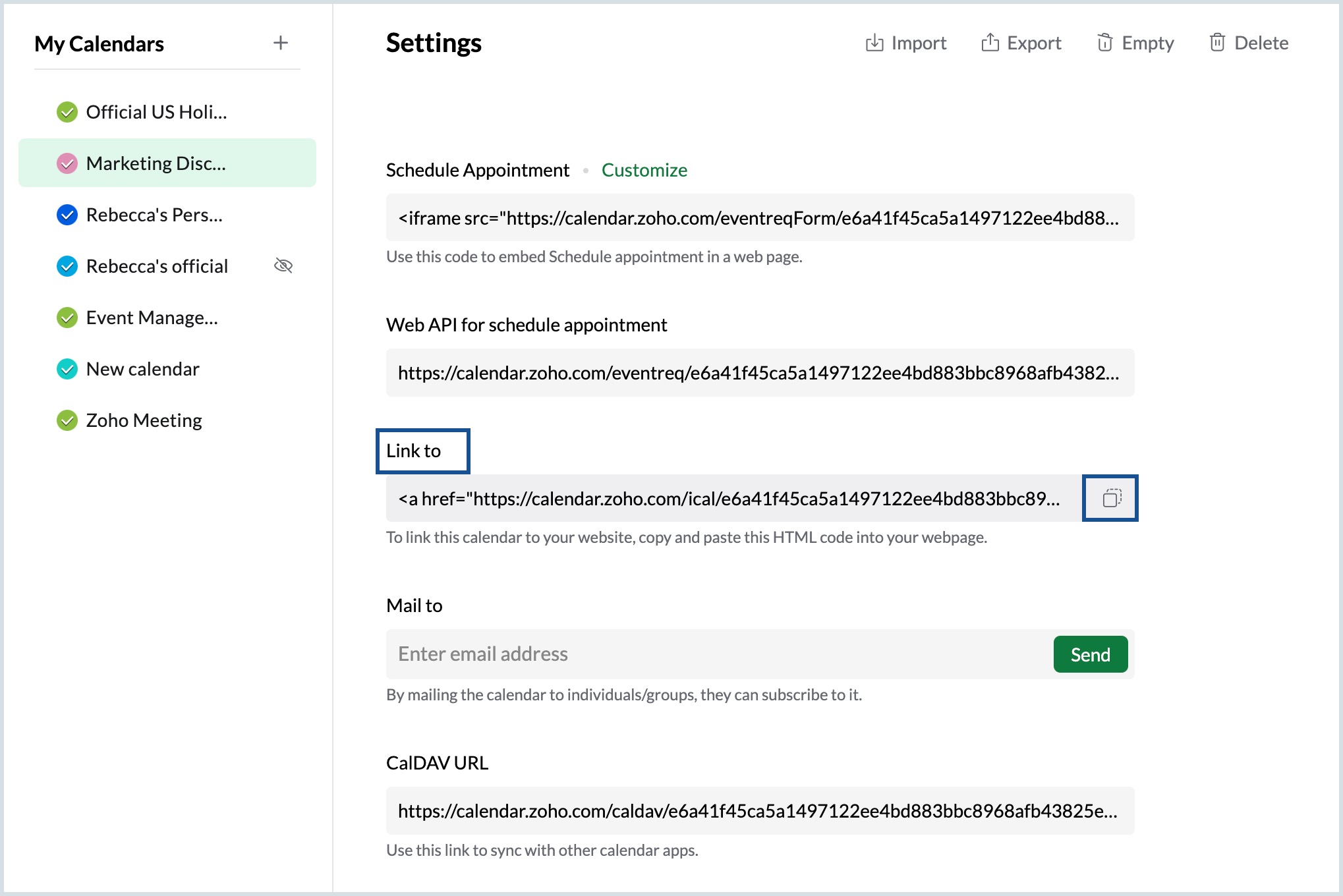 - Enter the email address of the individuals or groups under Mail to option in Public access and click Send to share the calendar link.