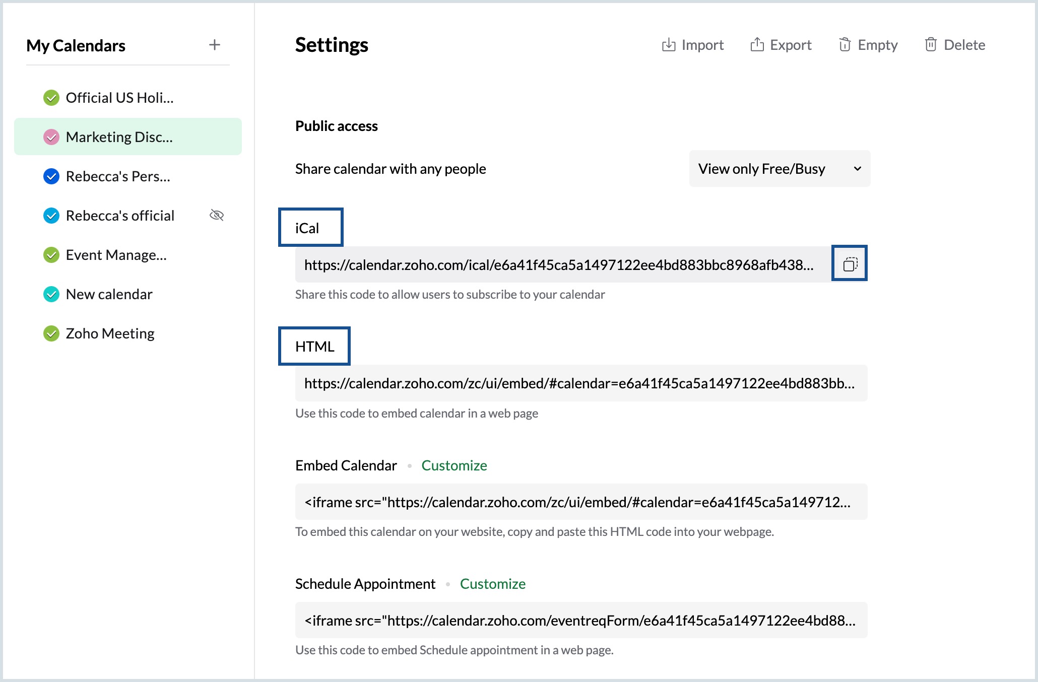- Click on copy link near iCal or HTML to copy the respective iCal/HTML URL for this public calendar and use it to share the calendar.