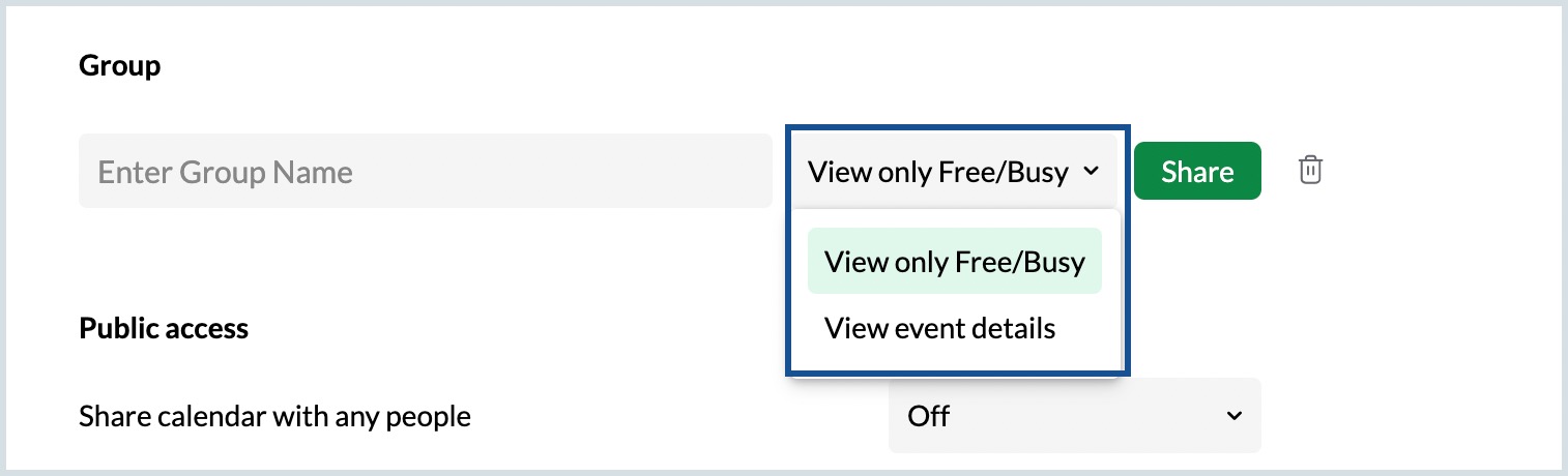 - For groups, select the permission from View Free/Busy and View Event Details in the drop-down.