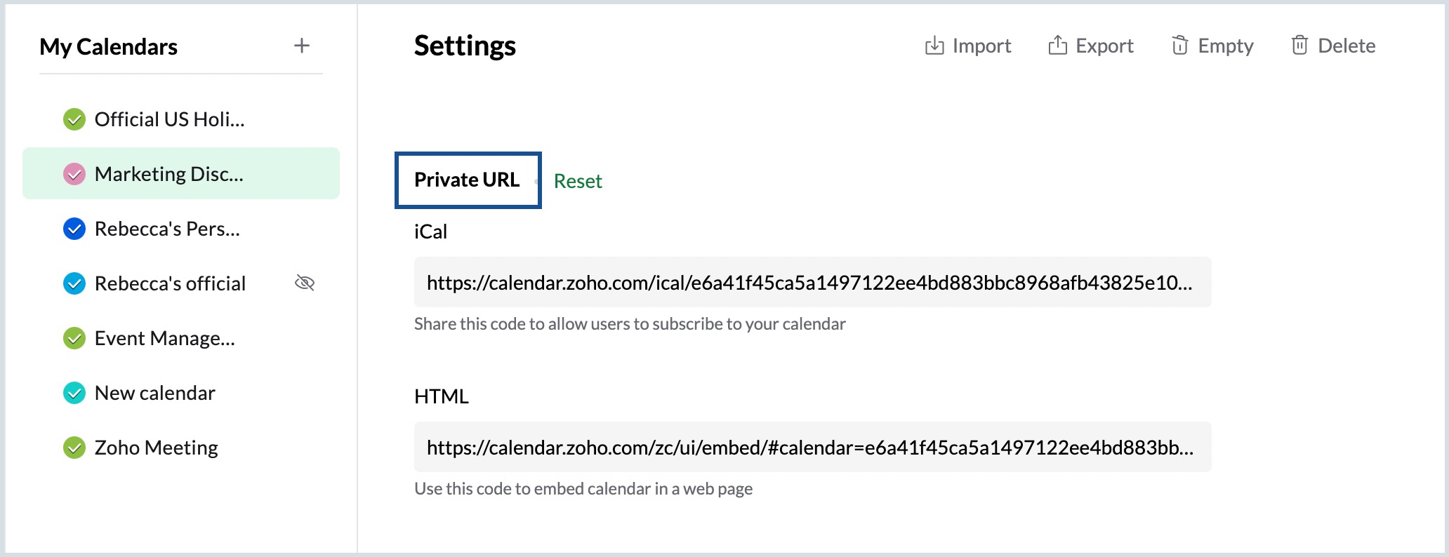 Private URL to reset the URL of your private calendar.