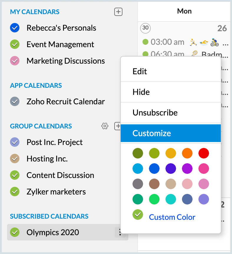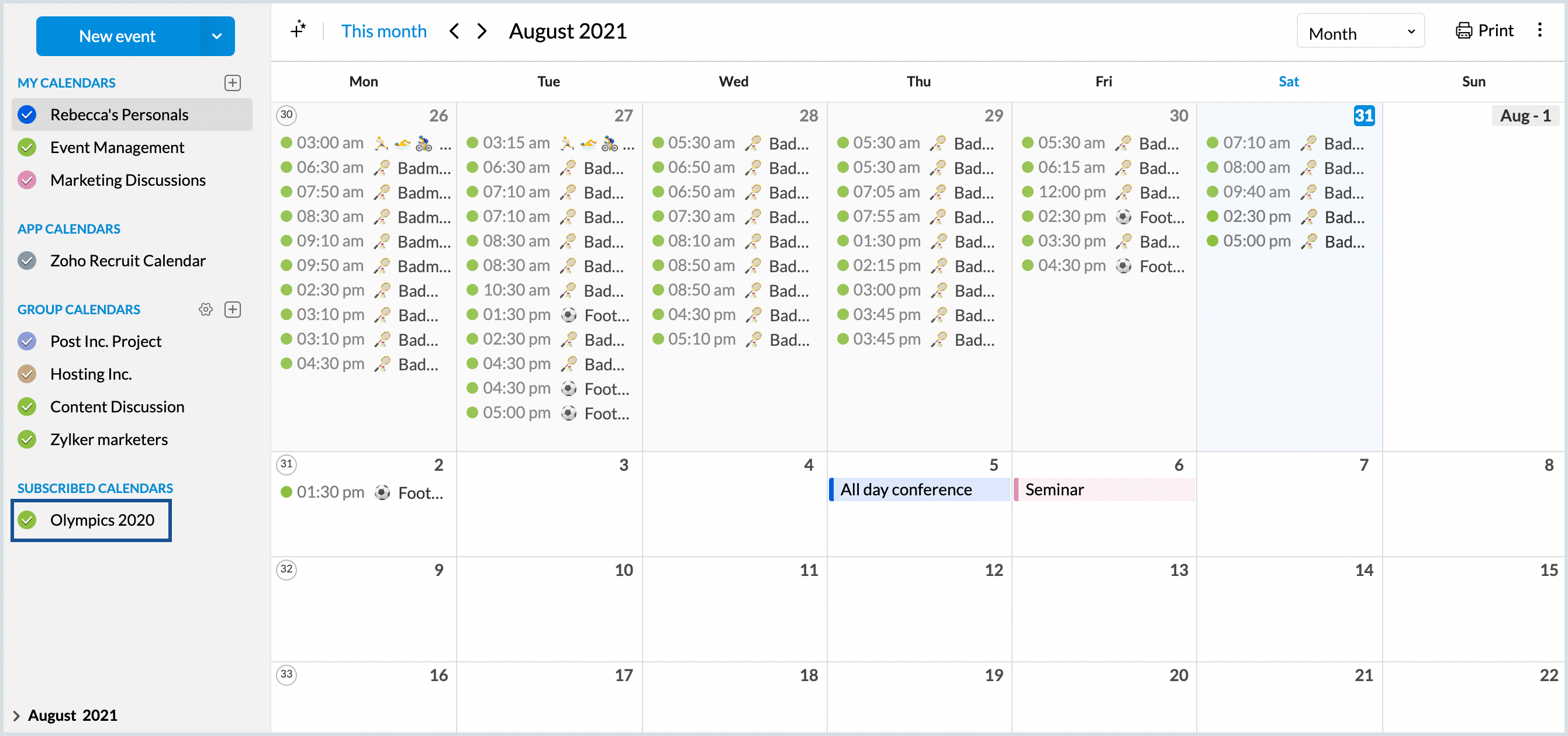 You can subscribe to the Tokyo Olympics 2020 schedule within Zoho Calendar and add the events to your calendar grid. You have the option to subscribe to your favourite sports and countries. You can change your preferences at any time.