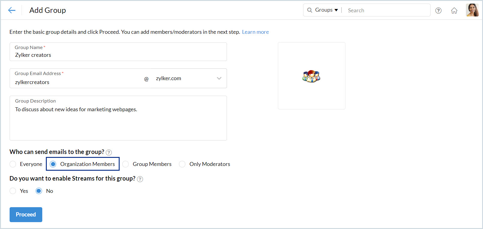 - Select Yes/ No under the Do you want to enable Streams for this group? field. If you choose Yes the group will be added to Streams in Zoho Mail.