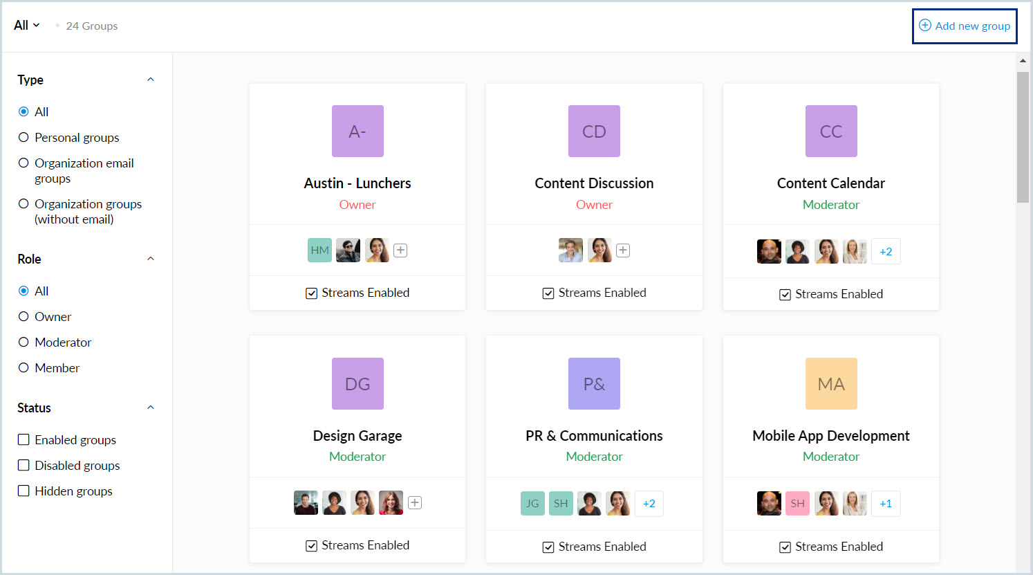 Personal groups can be created by any user using their Zoho account. These groups can contain members only from inside the organization. The main purpose of personal groups is to communicate for internal/personal purposes.