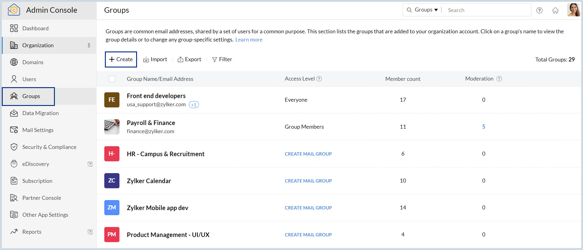 Organization groups belong to the organization/company that you are a part of. These groups are created for communication or to send announcements to the members in a particular department or organization. These groups can be created by the organization administrator only. Organization groups are available with and without email. You can choose the appropriate option while creating the group.