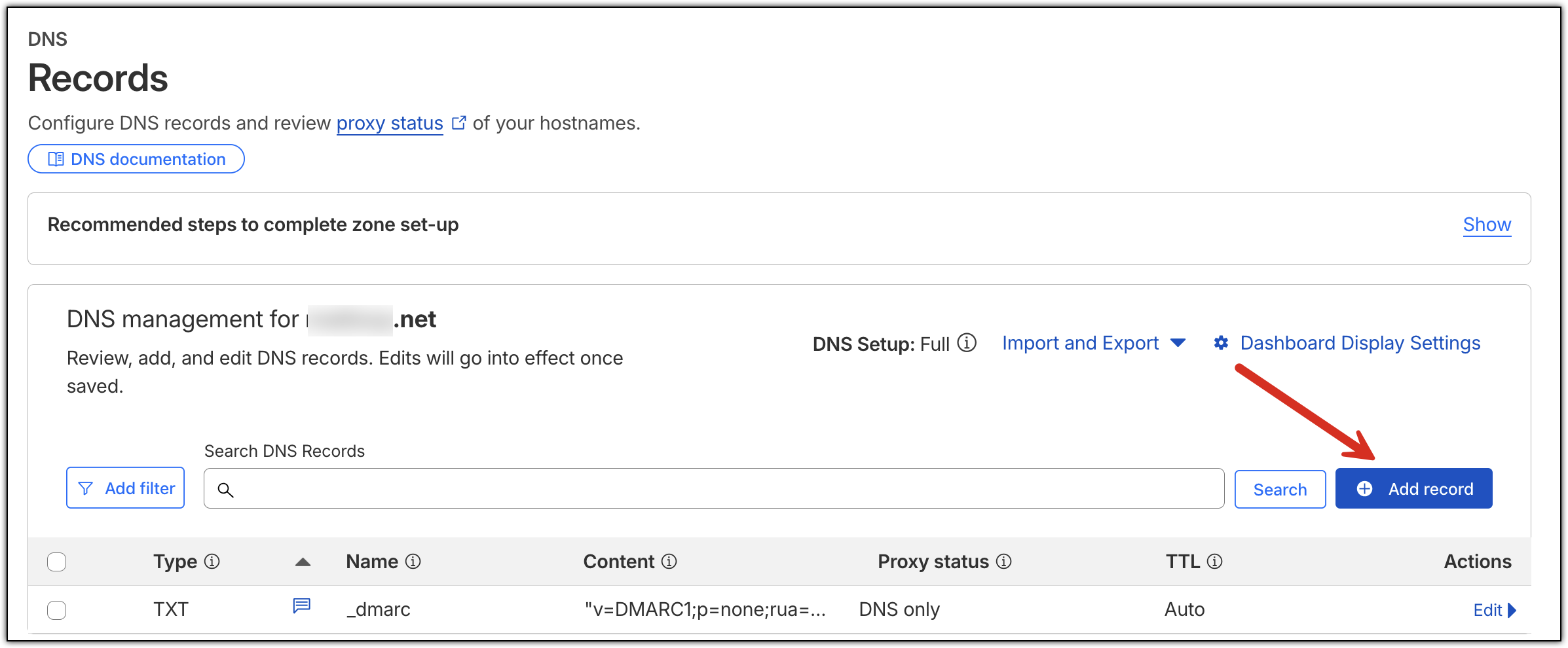 Note: A sender domain can have only one SPF TXT record. We recommend not to add a new record if you already have one. If you have an existing SPF TXT record,
