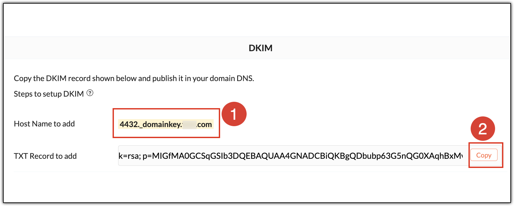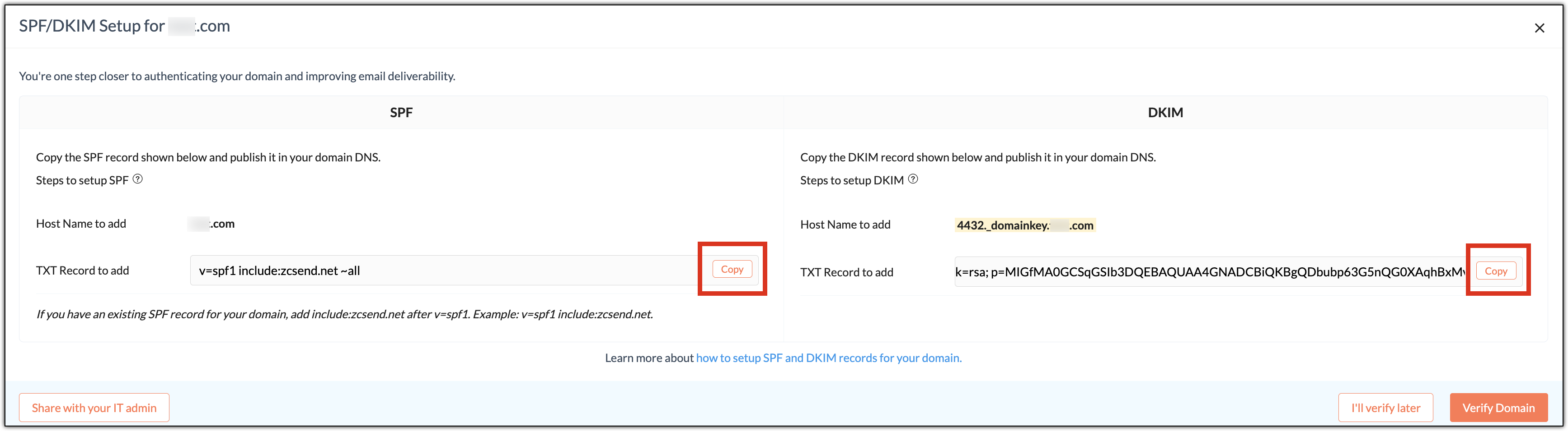 4. On the Setup page, click the Copy button next to the SPF and DKIM records. First copy the SPF, paste it in your domain's DNS settings. Then do the same for DKIM.