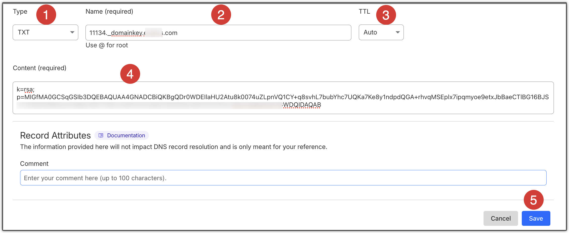 - Content: Paste the DKIM record you copied from Zoho Campaigns in this field