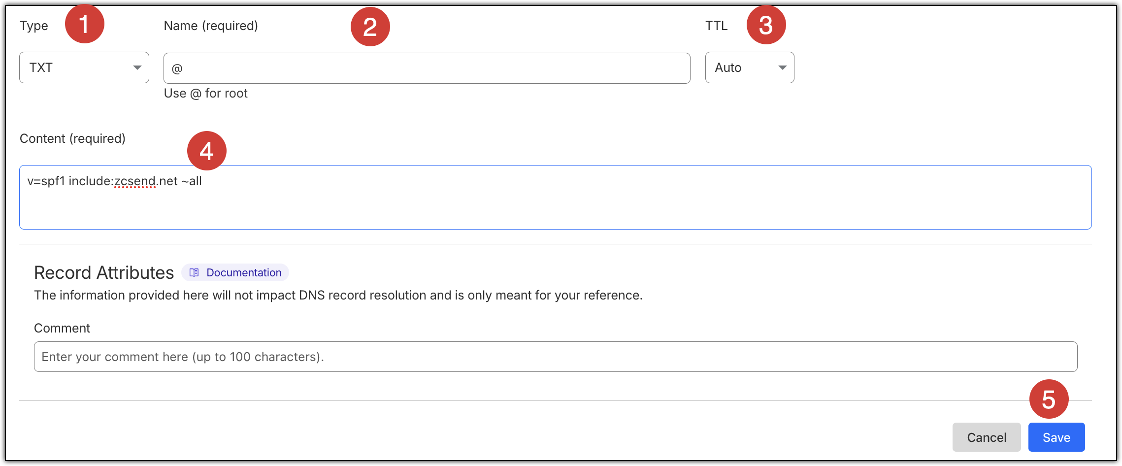 - Content: Paste the SPF record you copied from Zoho Campaigns in this field.