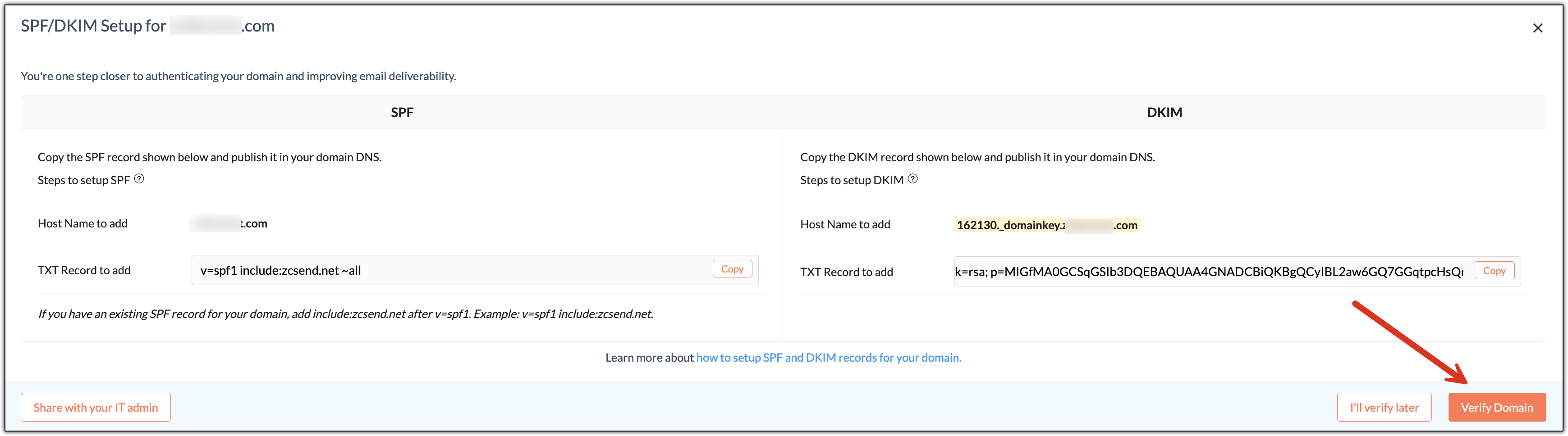 - Verify your domain in your Zoho Campaigns account after adding the SPF and DKIM TXT records to the DNS server.