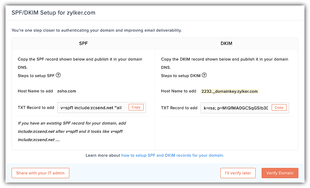 - Copy the SPF and DKIM TXT records from your Zoho Campaigns account.