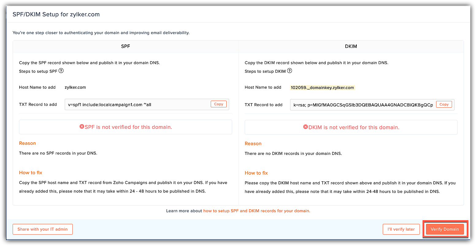- Verify your domain in your Zoho Campaigns account after adding the SPF and DKIM TXT records to the DNS server.