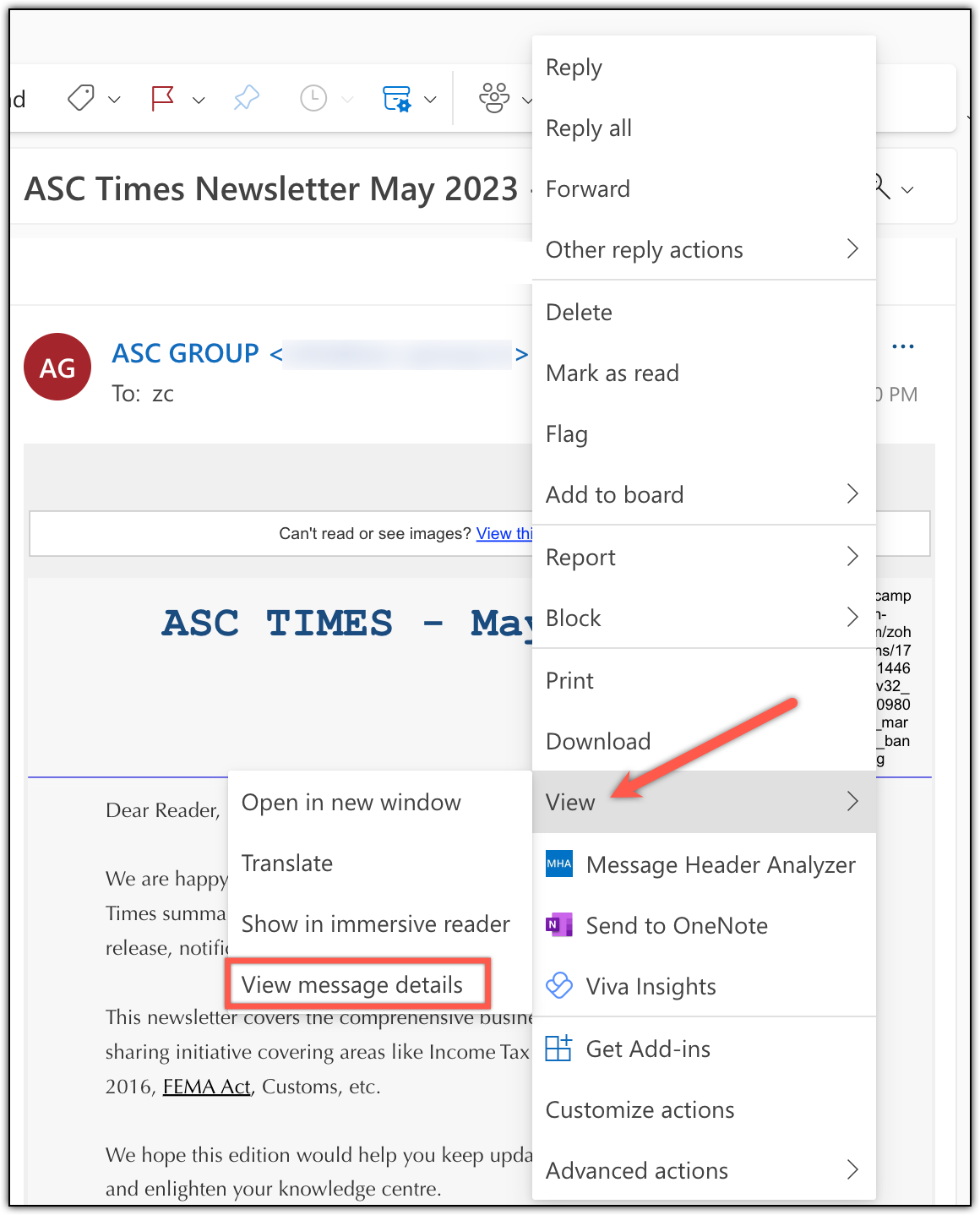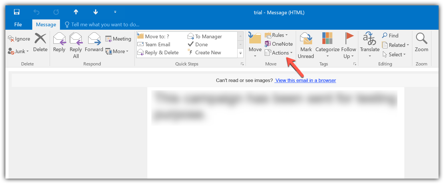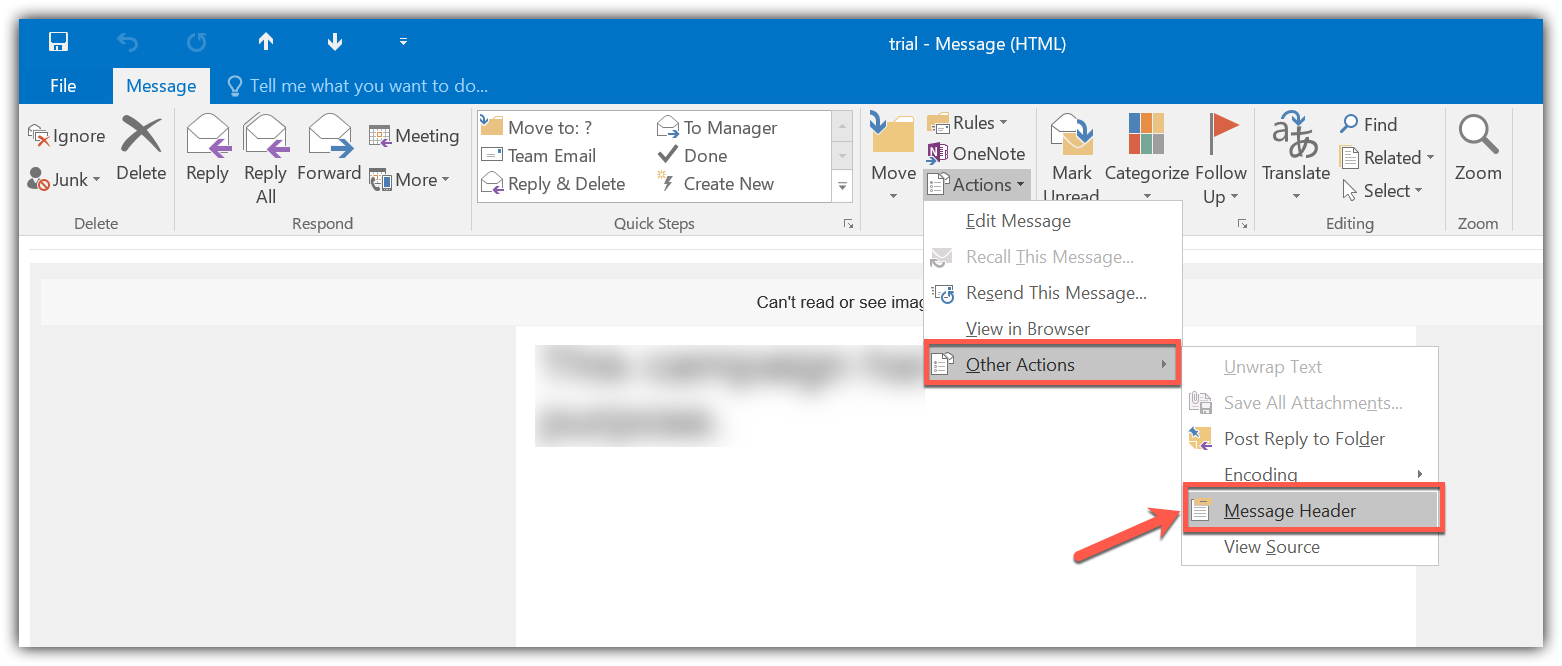3. In the Move section, click on Actions >> Other Actions >> Message Header.