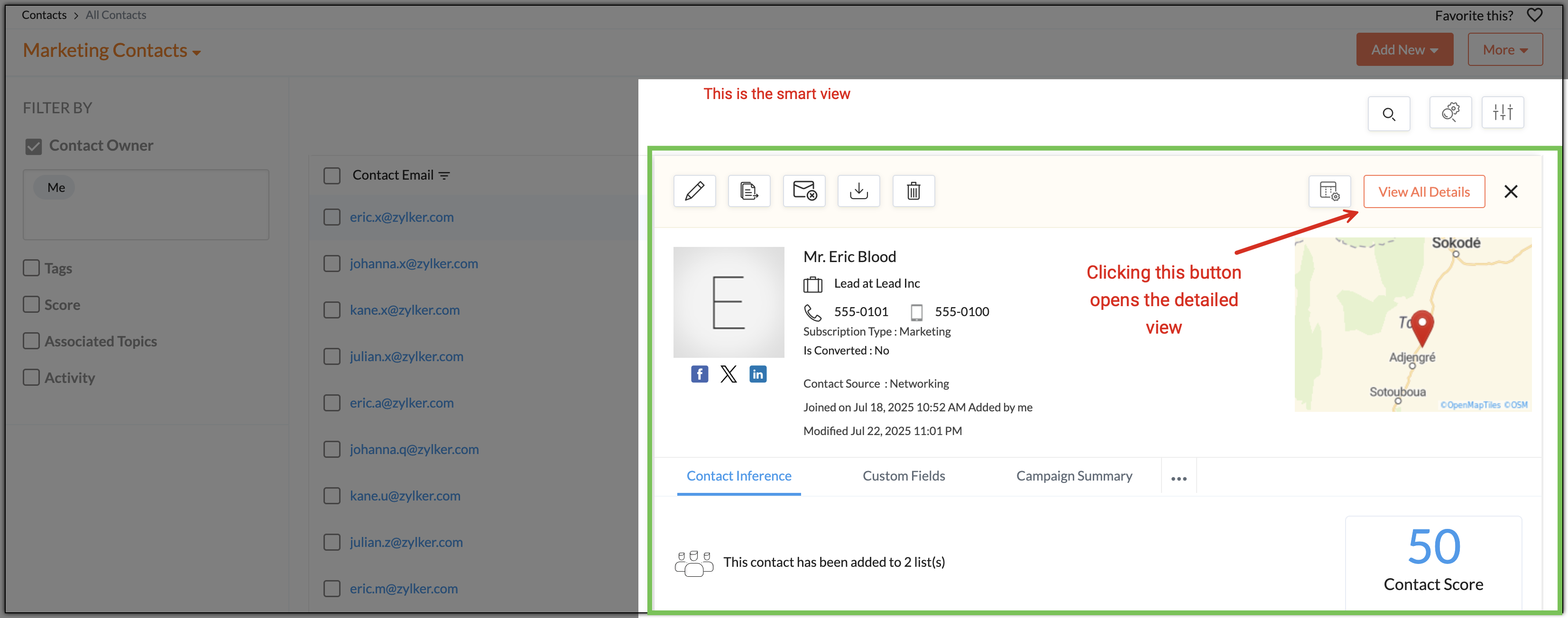 What is a smart view and how to access it? Smart view is present under Contacts -> All Contacts. It is a view that displays the essential details of a contact, such as the name, email address, associated lists, Zoho CRM data, etc. You can also ...
