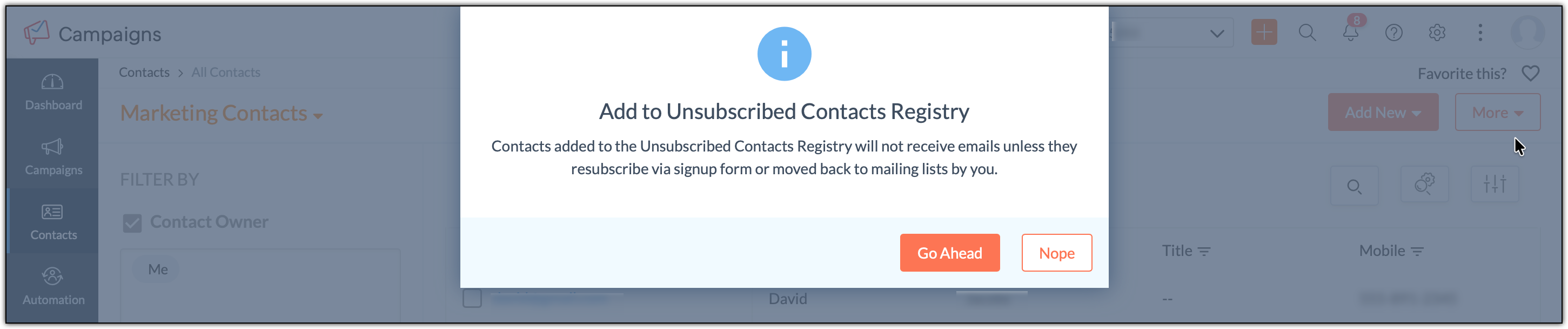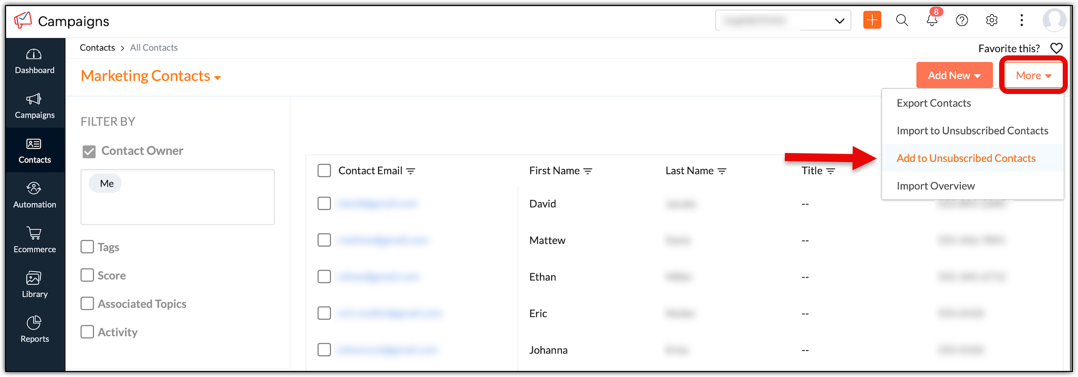 To add any contacts directly to the Unsubscribed Contacts view, follow the steps mentioned below: