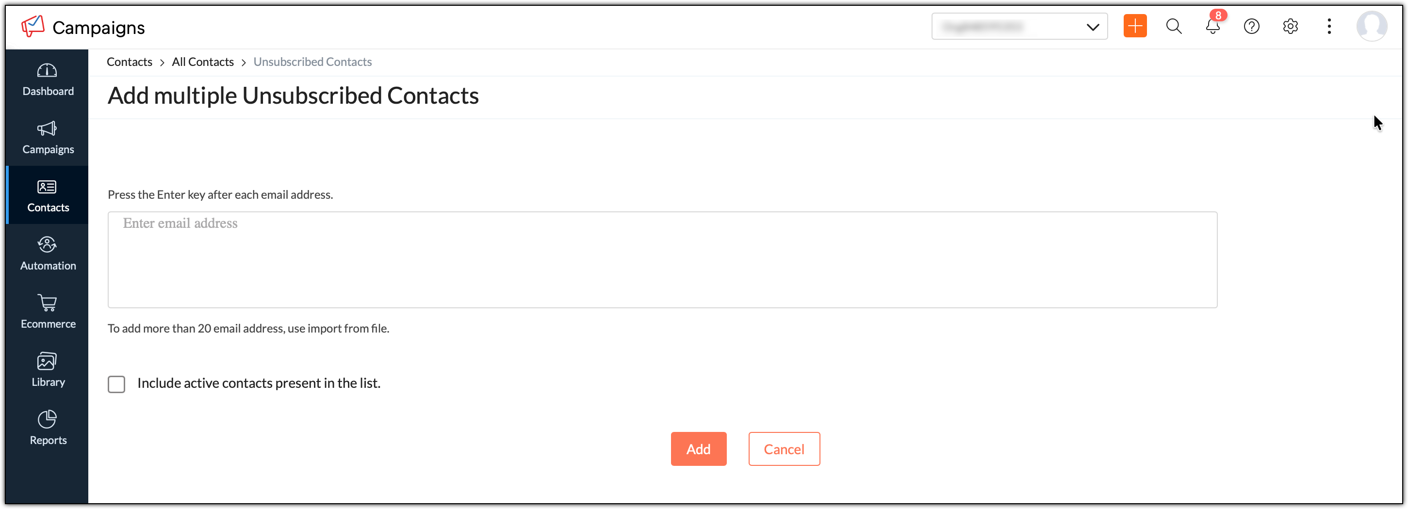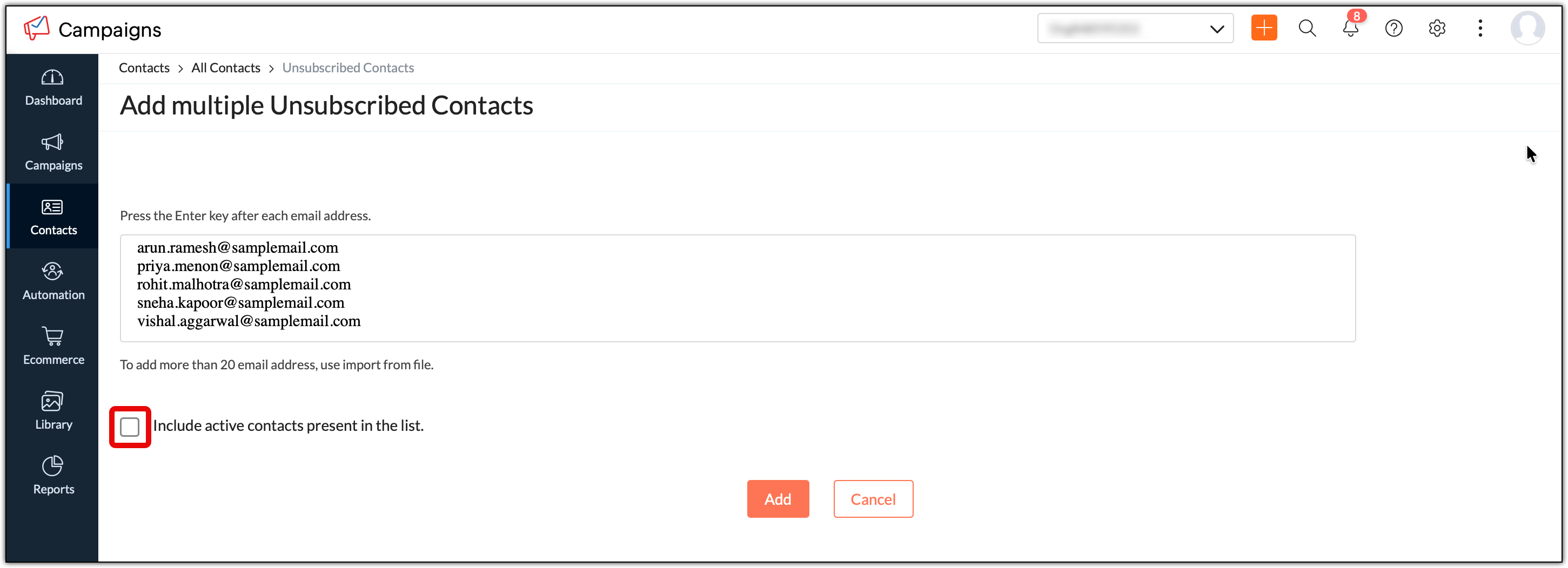 6. After entering the email addresses of your contacts that you want to add to the Unsubscribed contacts view, you can choose to select the button to include any active contacts found in the email list as Unsubscribed.
