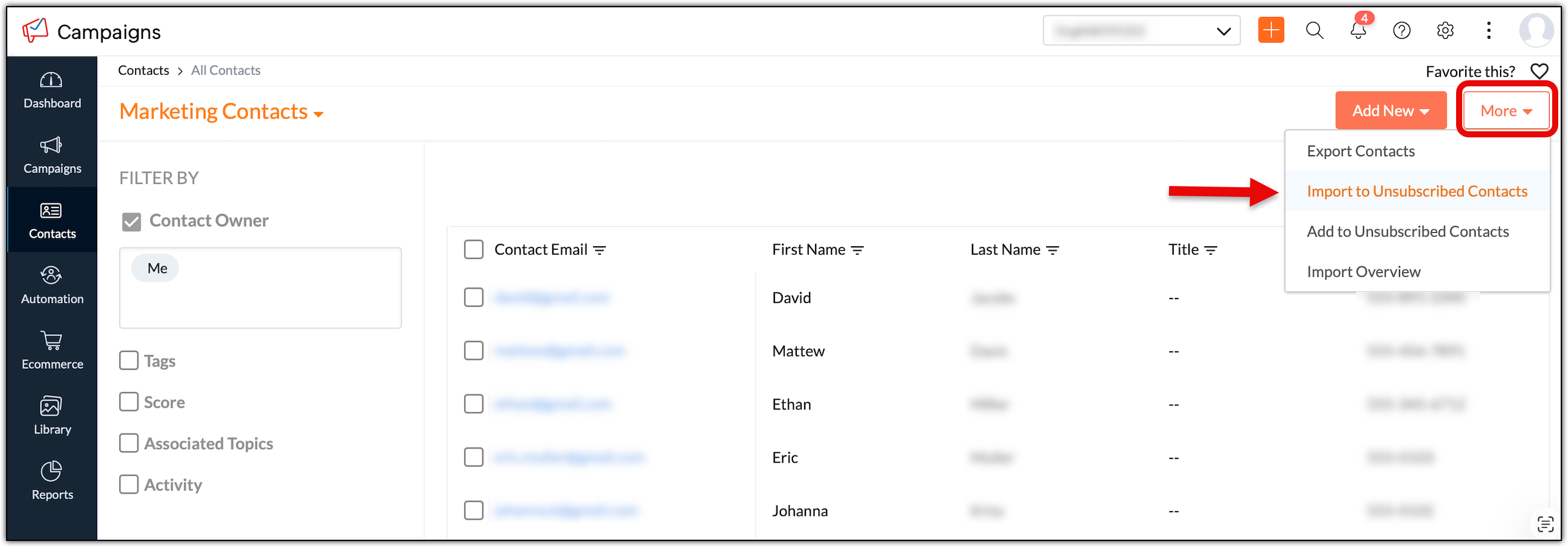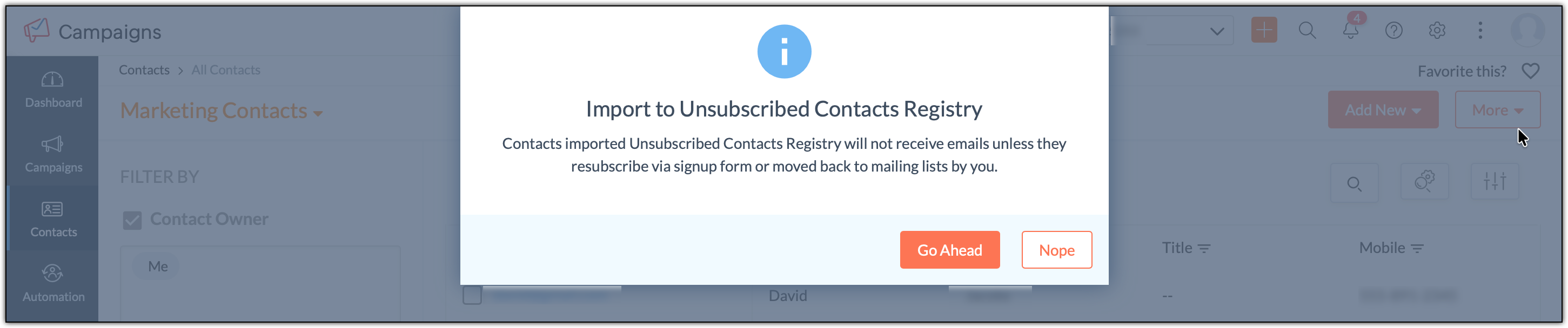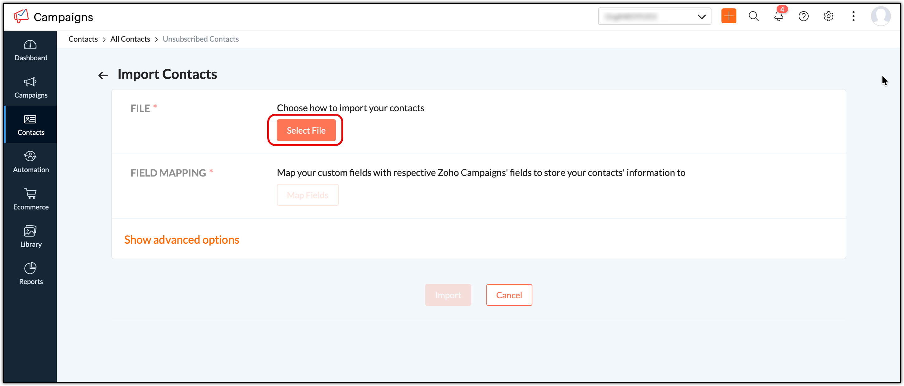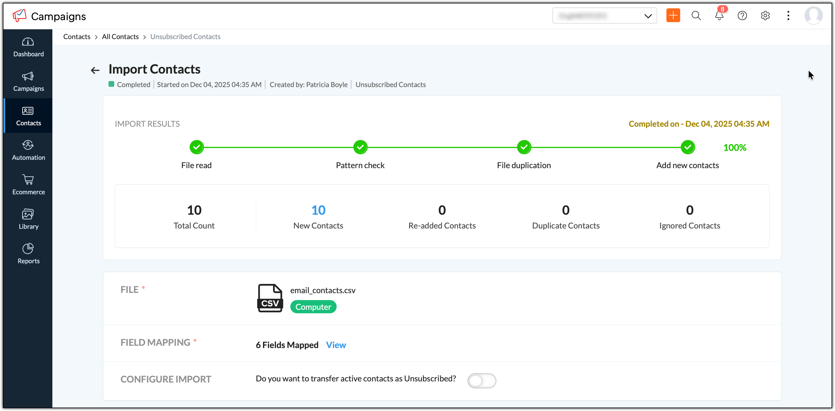9. Select Import and Zoho Campaigns will start adding your contacts from the file to the Unsubscribed Contact list directly.