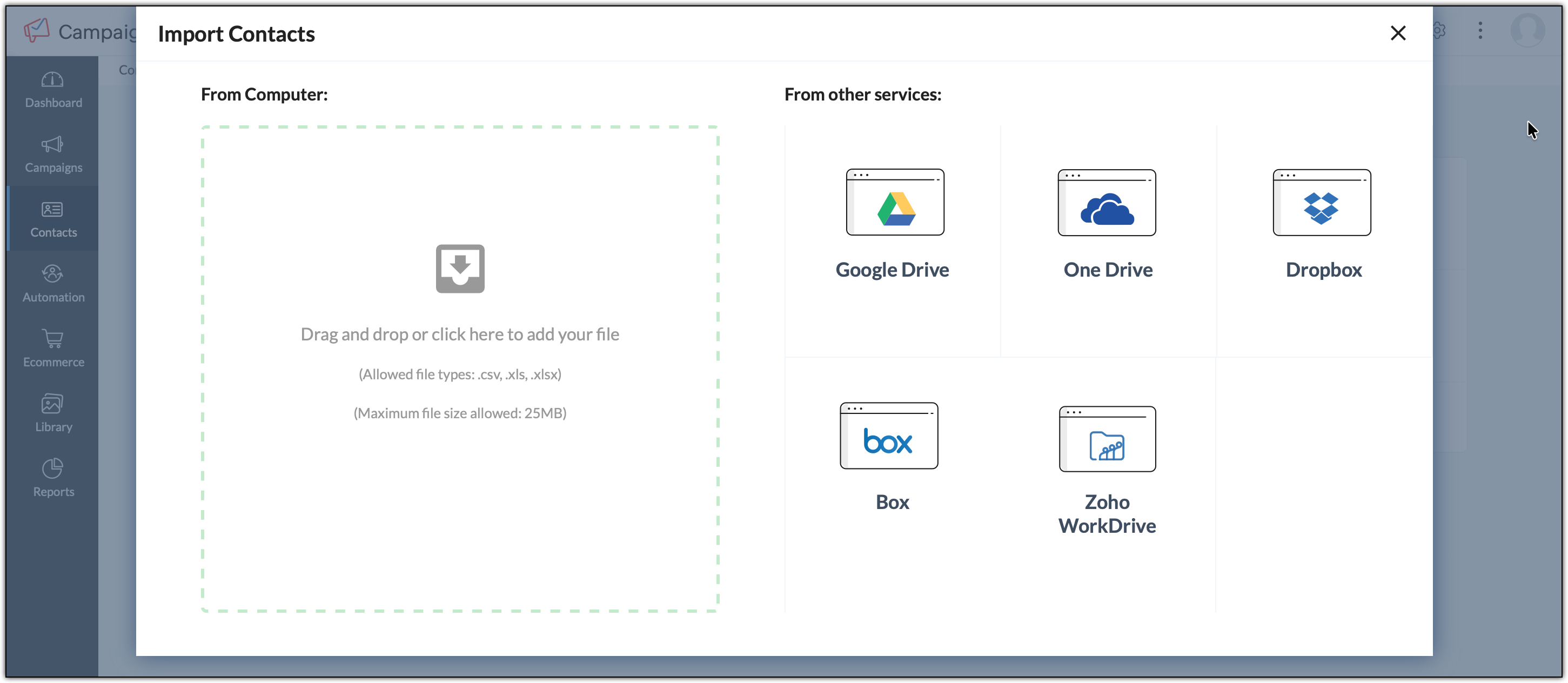 6. Upload your contacts from any source into Zoho Campaigns in .csv, .xls, .xlsx format.