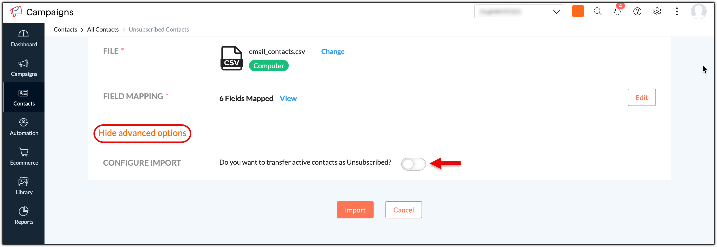 8. You can drop down the advanced options section and select the toggle button to configure import criteria to transfer any active contacts found in the file as Unsubscribed.