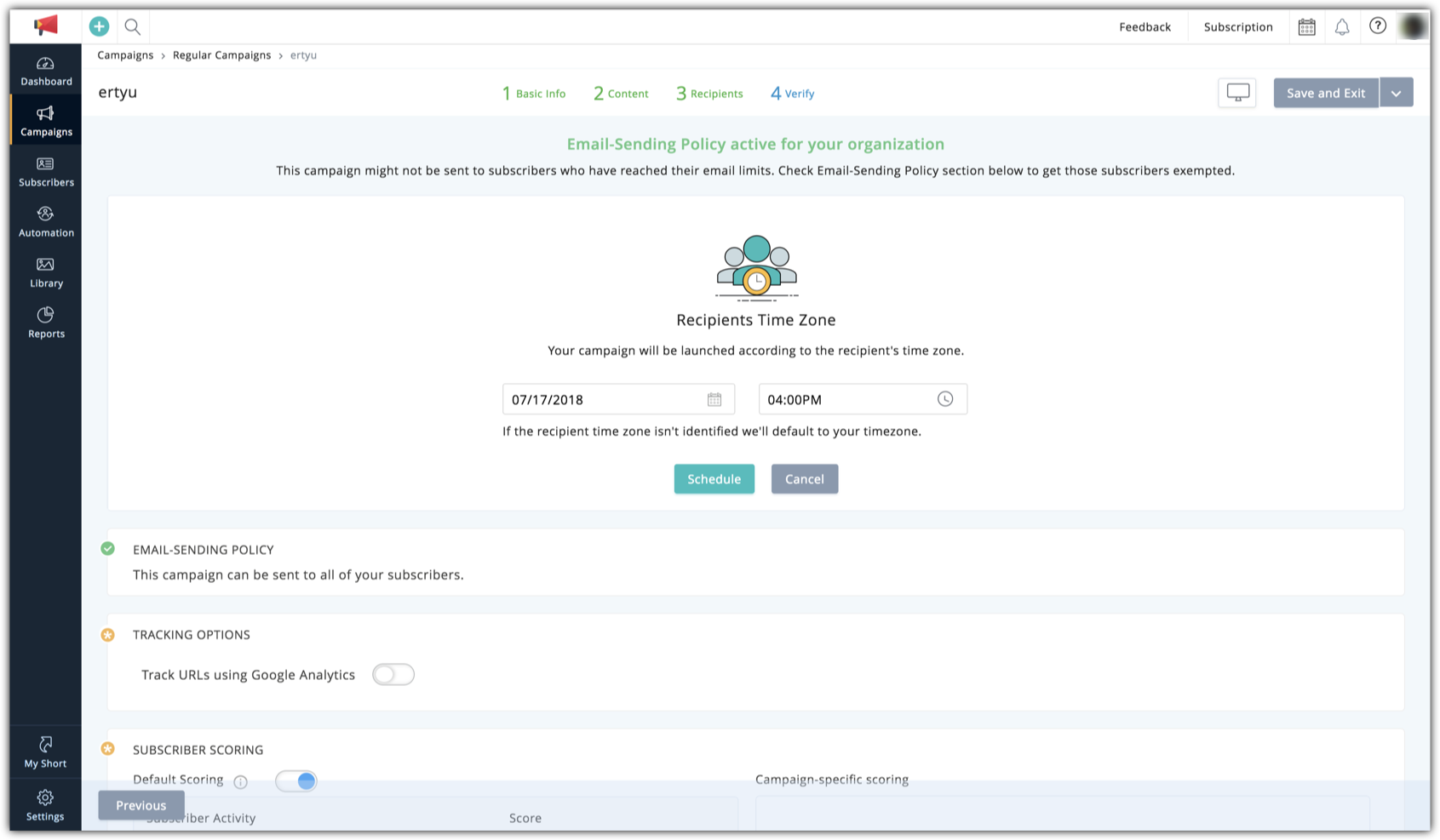 To schedule a campaign based on the recipient's time zone, follow these steps: