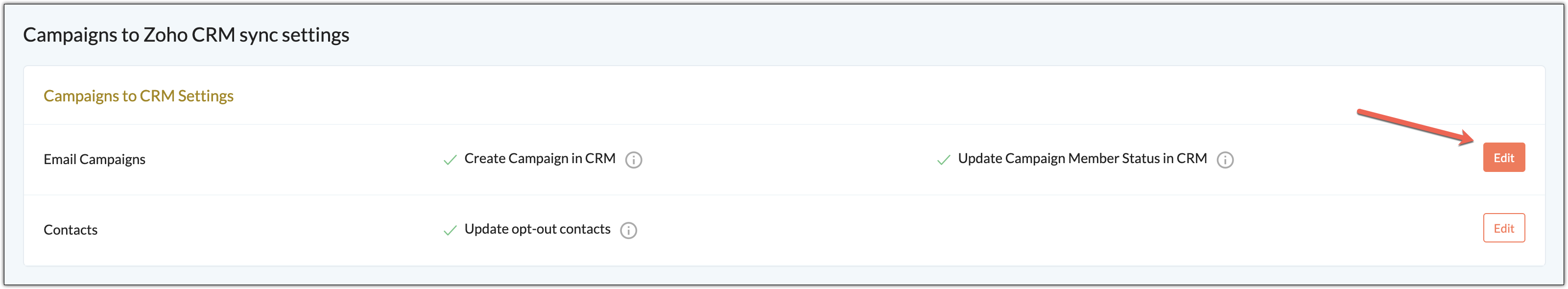 3. Click Edit under Campaigns to Zoho CRM sync settings.