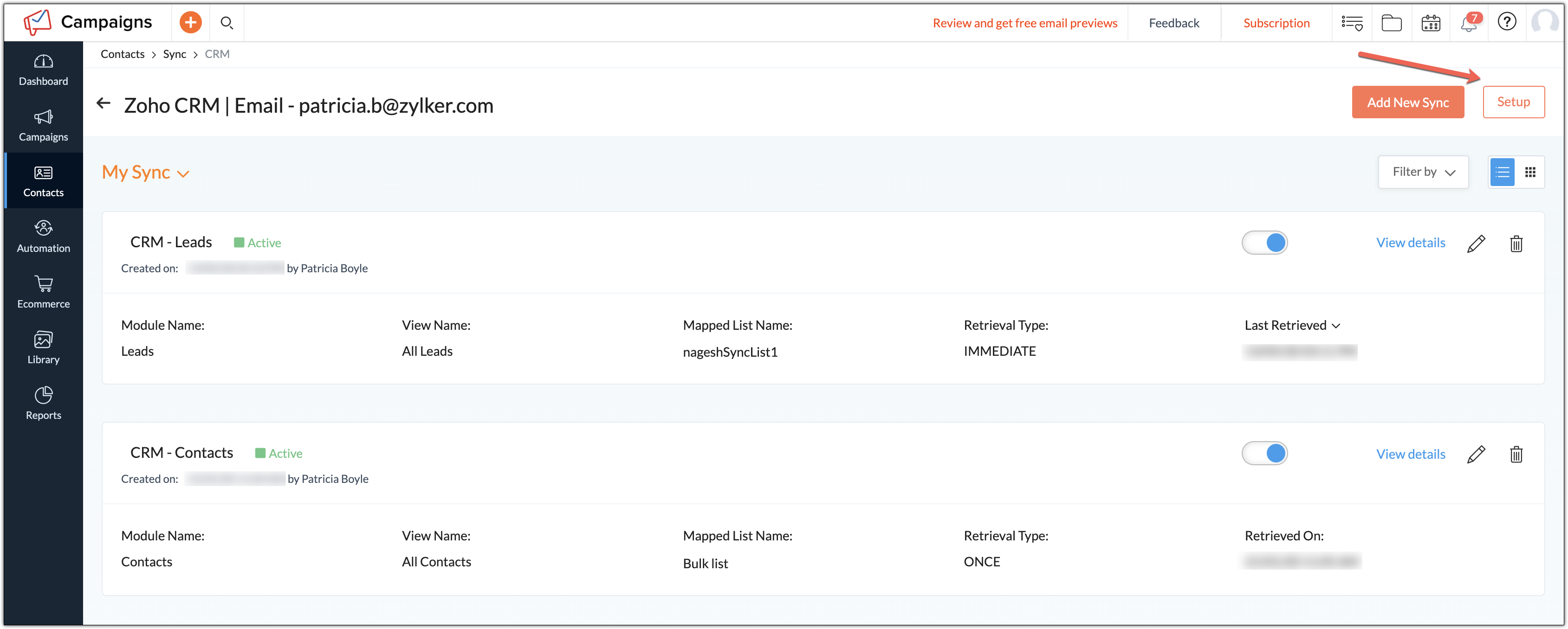 In the new sync setup, contacts and leads will remain synced, so contacts deleted from Zoho CRM will be removed from Zoho Campaigns automatically.