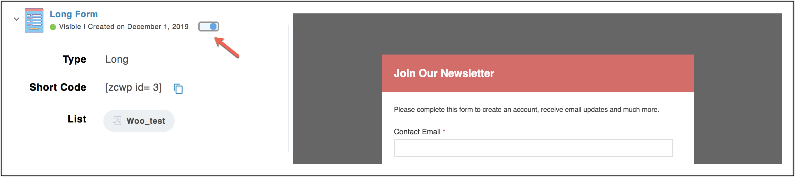 4. Once you generate the short code, the signup form will be active and can be made visible in of your web pages.