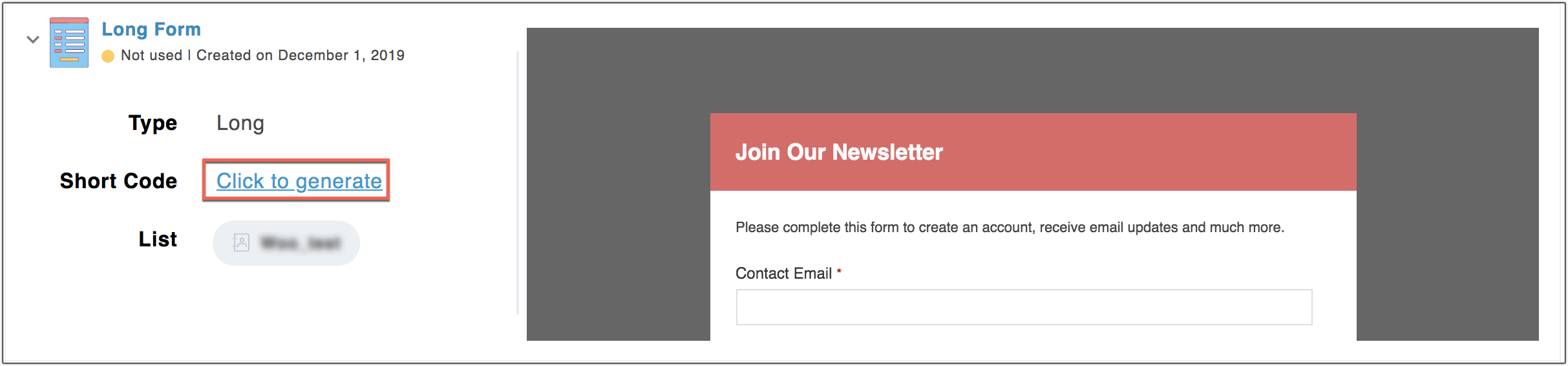 3. Click Click to generate to generate the signup form's short code.
