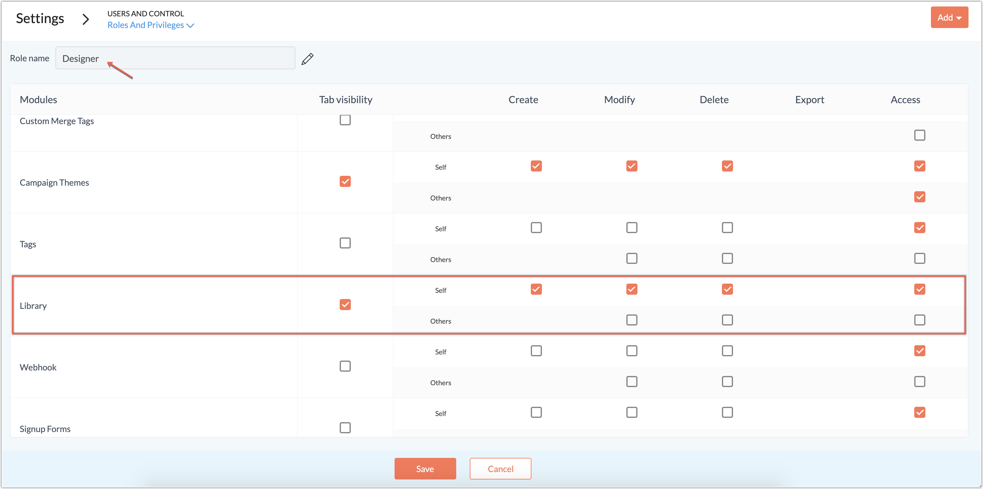 I am the Standard Admin for the Zylker Campaigns account. I would like to  allow designers to access only Library module. How can I do this?