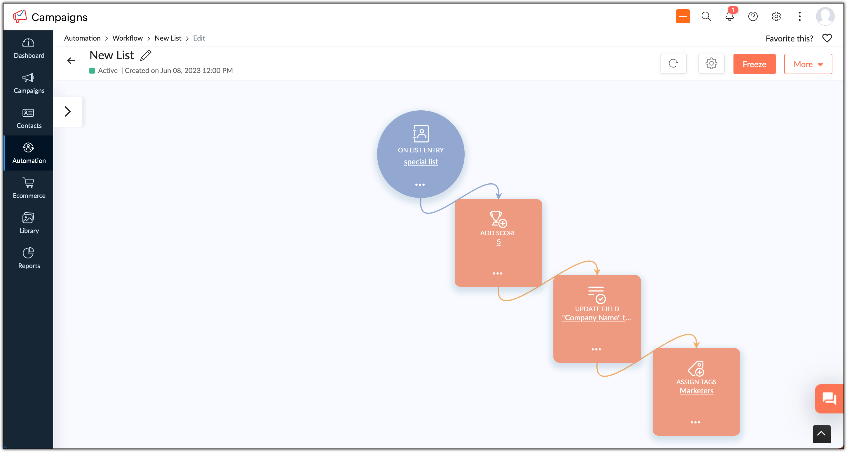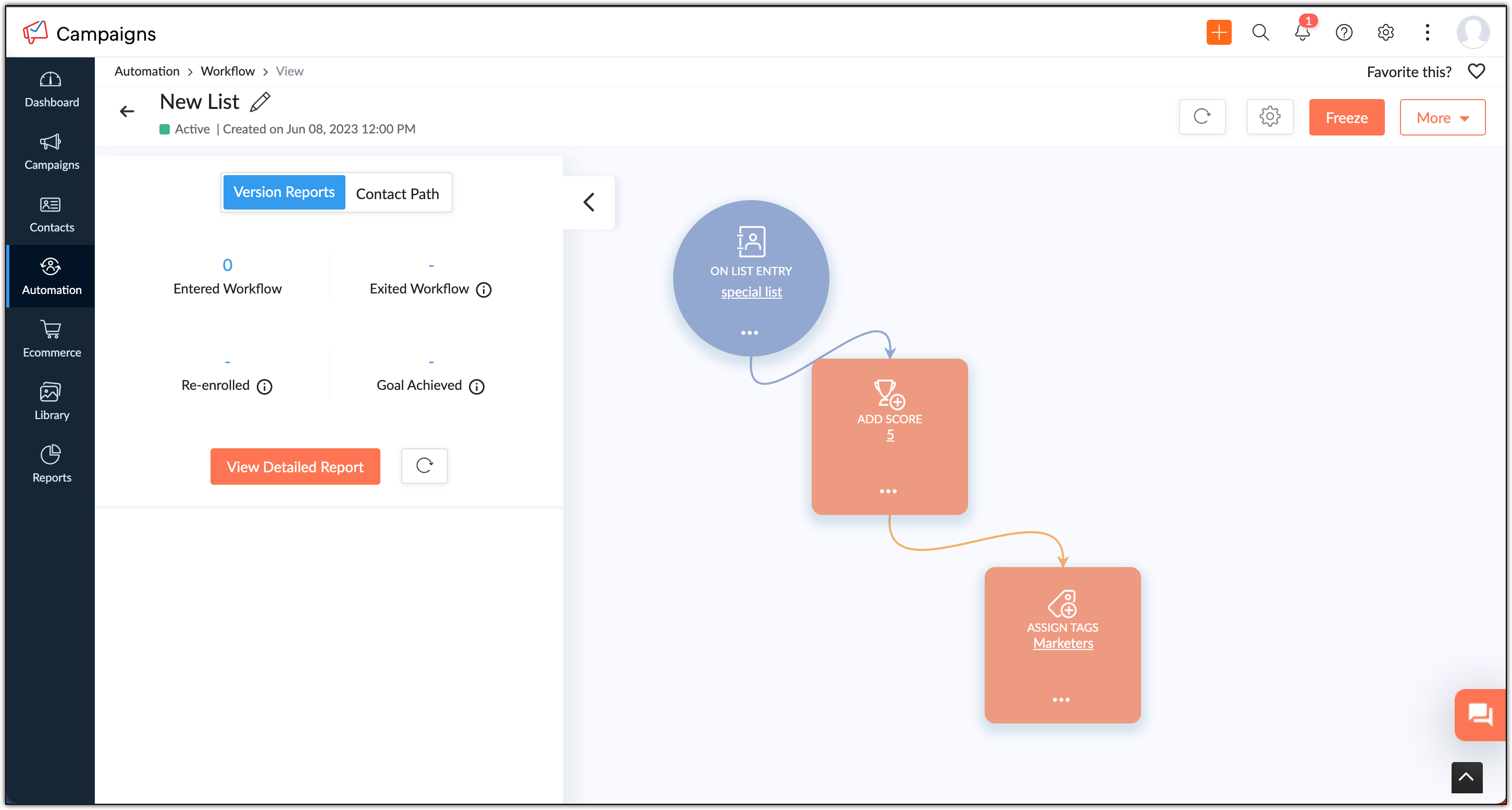 Realising that all those who've attended the webinar are not content marketers, you decide to delete that component. So you edit the workflow and delete the 'update field' component and reactivate the workflow. Here, the contacts who've already entered the 'update field' component will be stuck and will not move forward in the workflow and only the new contacts will be assigned with the new tag.
