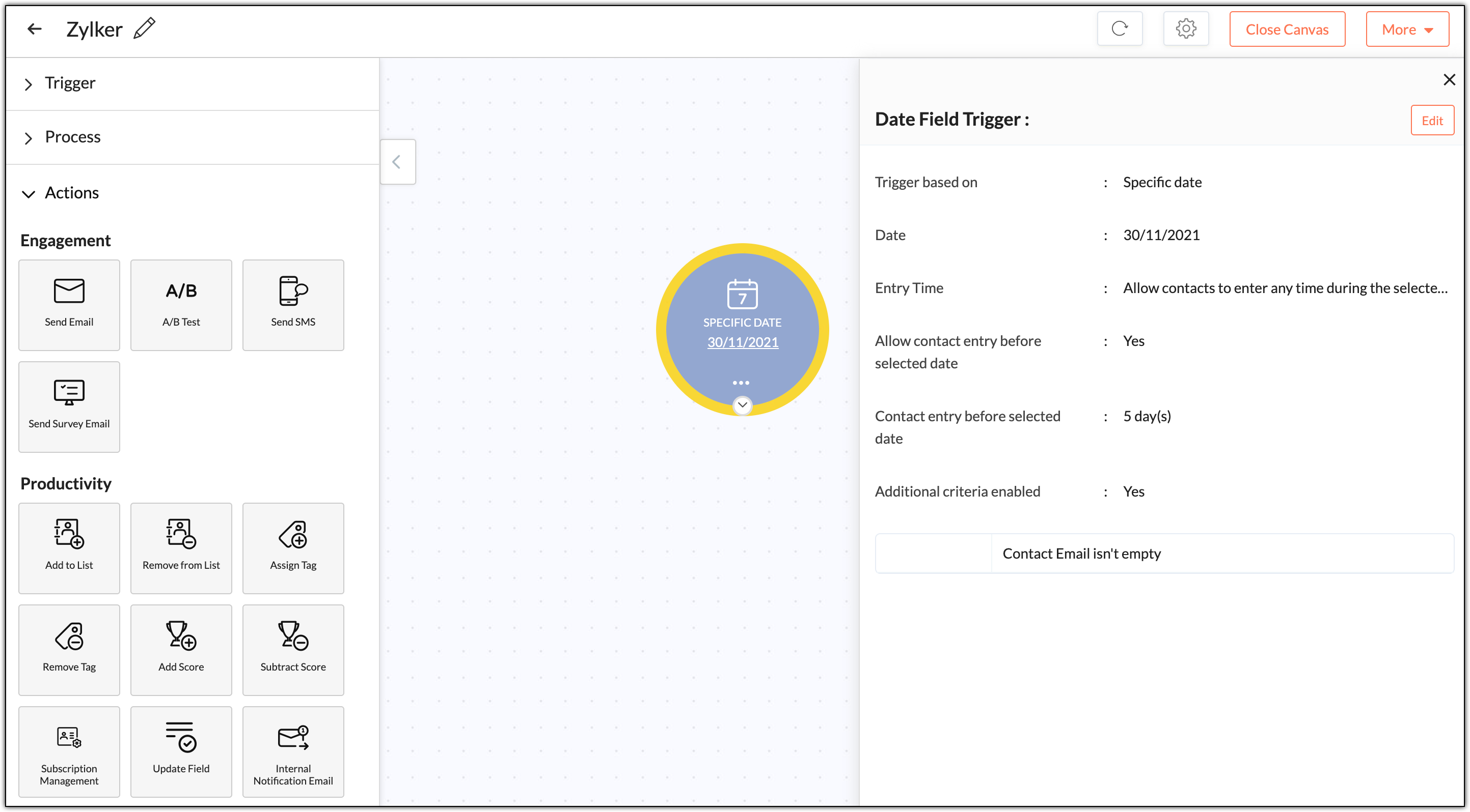 2. You can also edit the date field trigger from the detail view on the right side of the canvas by clicking the Edit button.