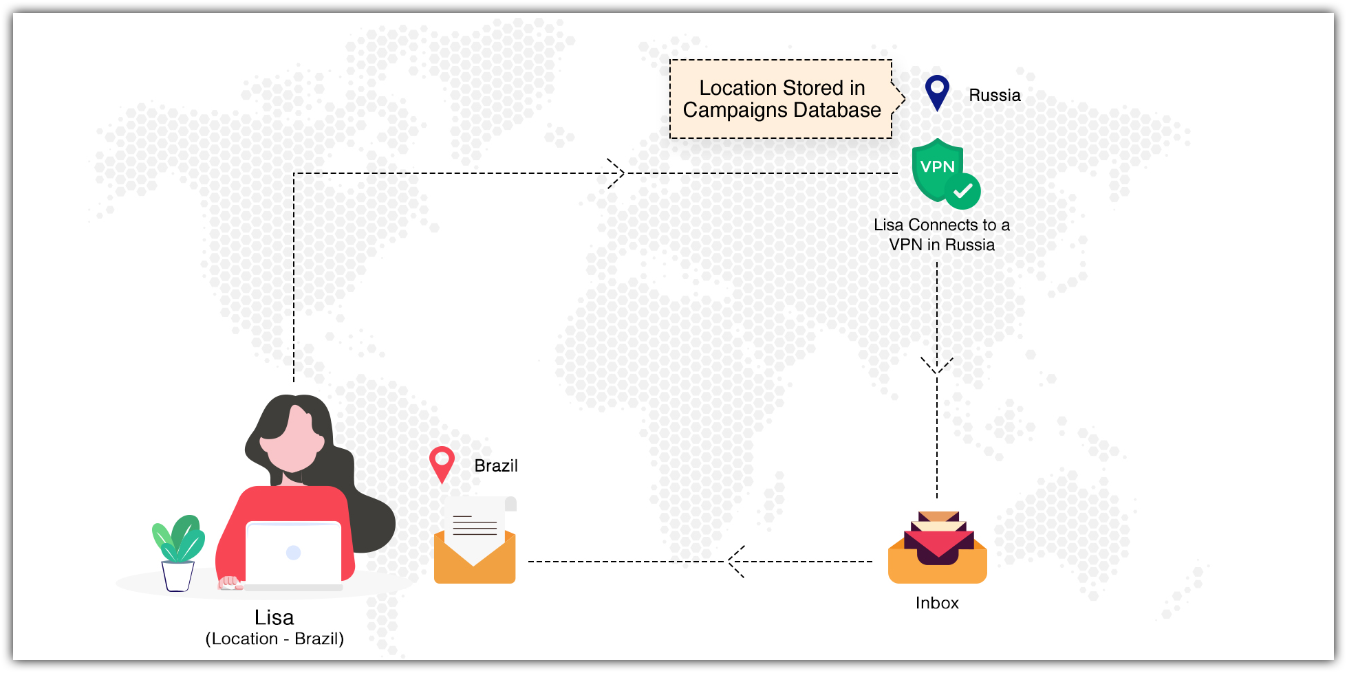 For example, if an email recipient in Brazil uses a VPN in Russia to access their mailbox, the location of the IP address (Russia) is assumed to be the email recipient's location.