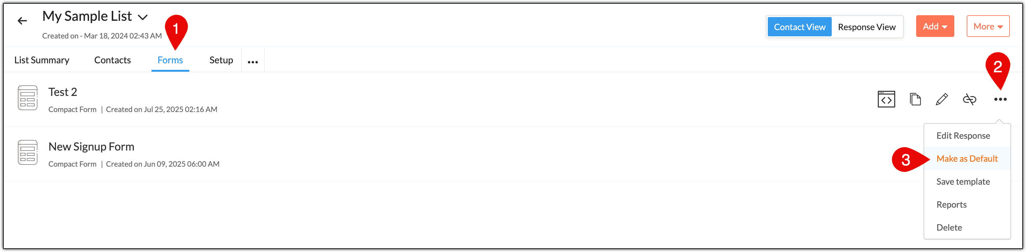 Definitely. You can make any signup form associated to a mailing list as default. Open the Contacts tab and click Signup Forms. You will get the signup form list view. Hover over any form and click the More option. Click Make as Default option. From ...
