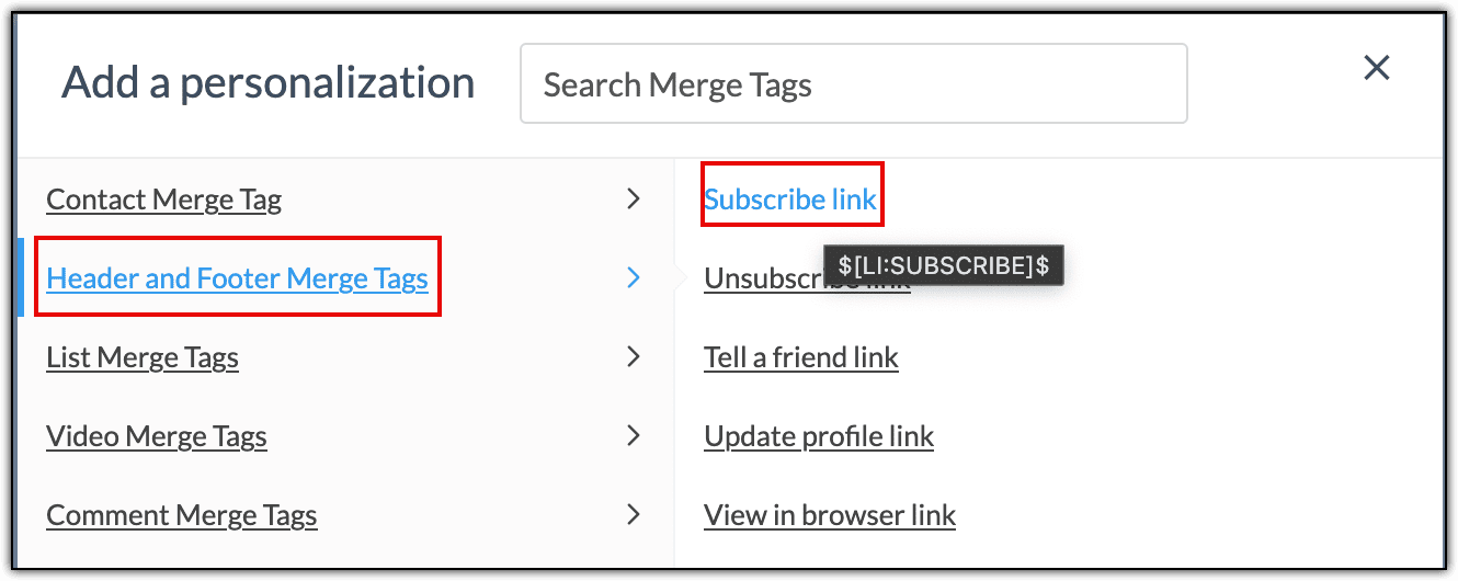 But setting the signup form alone as default isn't enough. You have to ensure you're selecting the list as a recipient when creating the email campaign. Not only that, but more importantly, you must include the 'Subscribe link' merge tag at the desired place in the email campaign you're sending. Only when the contacts click this merge tag will the signup form load.